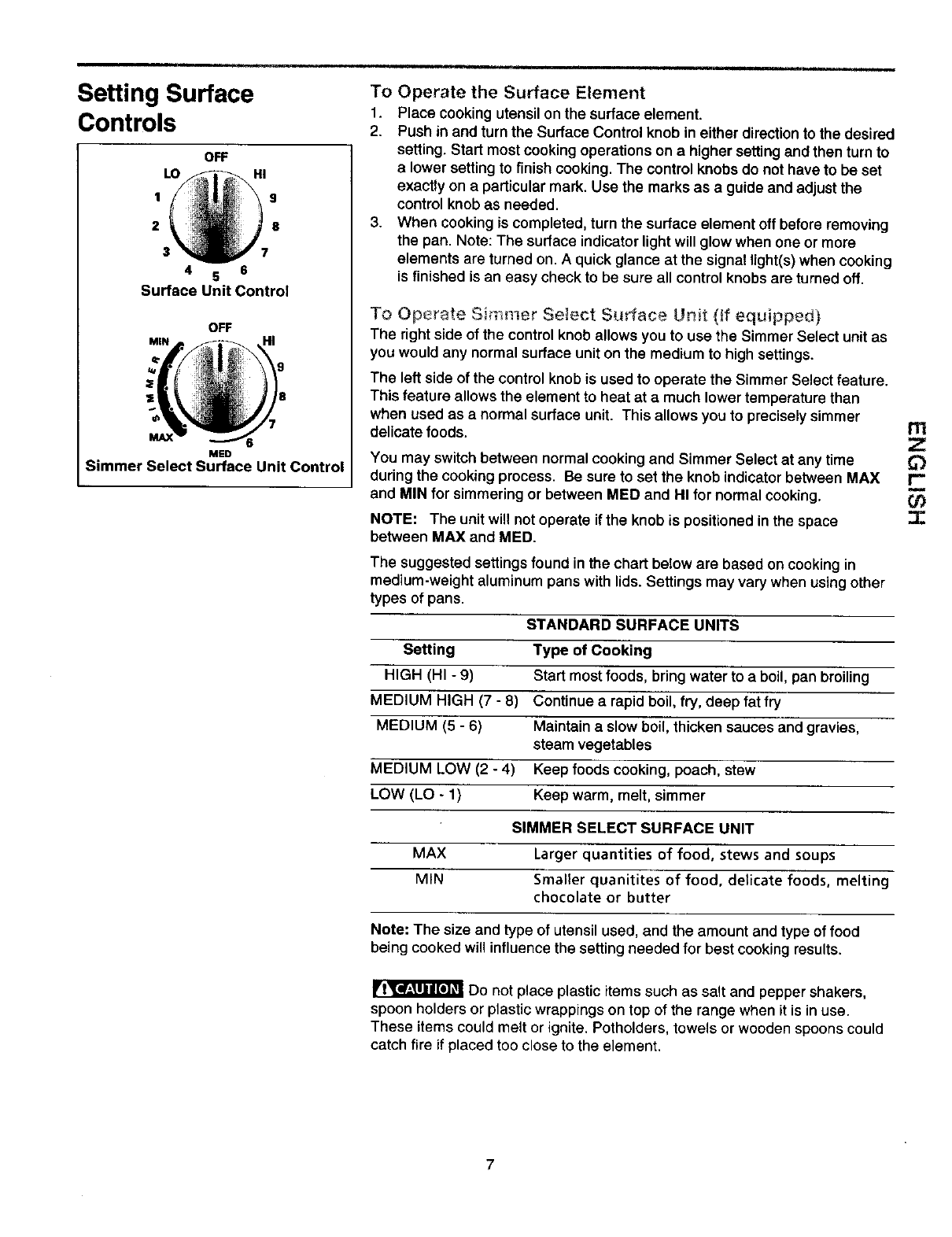 Surface element too hot or not hot Incorrect control setting. Make sure the correct control is on for the surface element