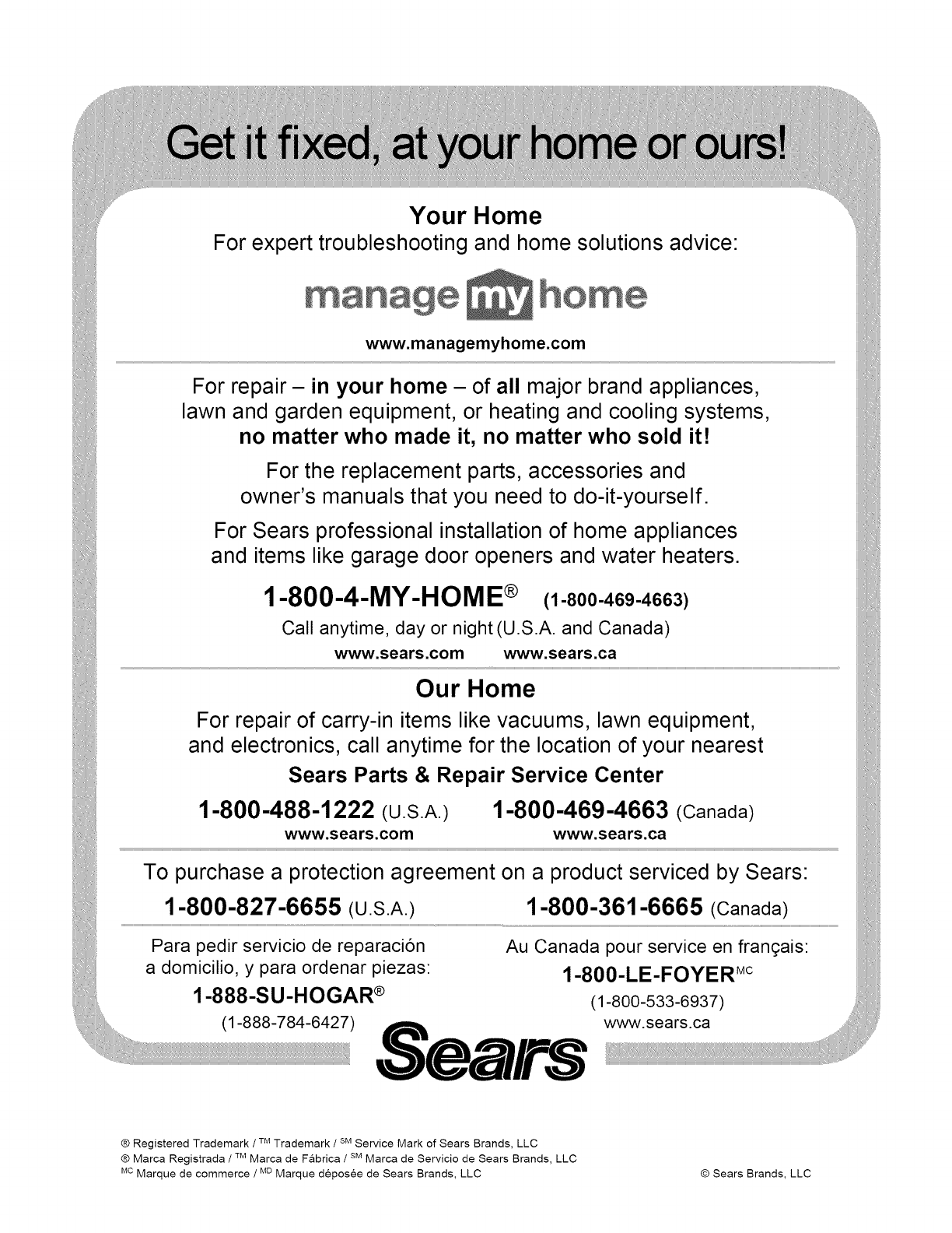 ® Marca Registrada /Marca de Fabrica /SMMarca de Servicio de Sears Brands, LLC