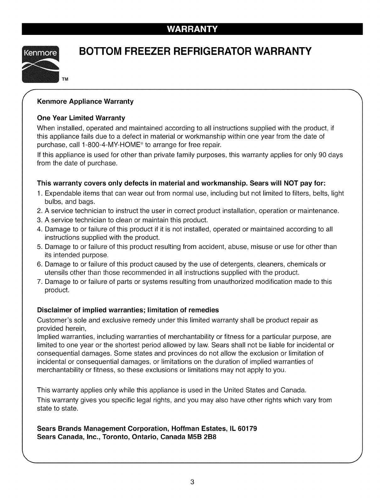 BOTTOM FREEZER REFRIGERATOR WARRANTY