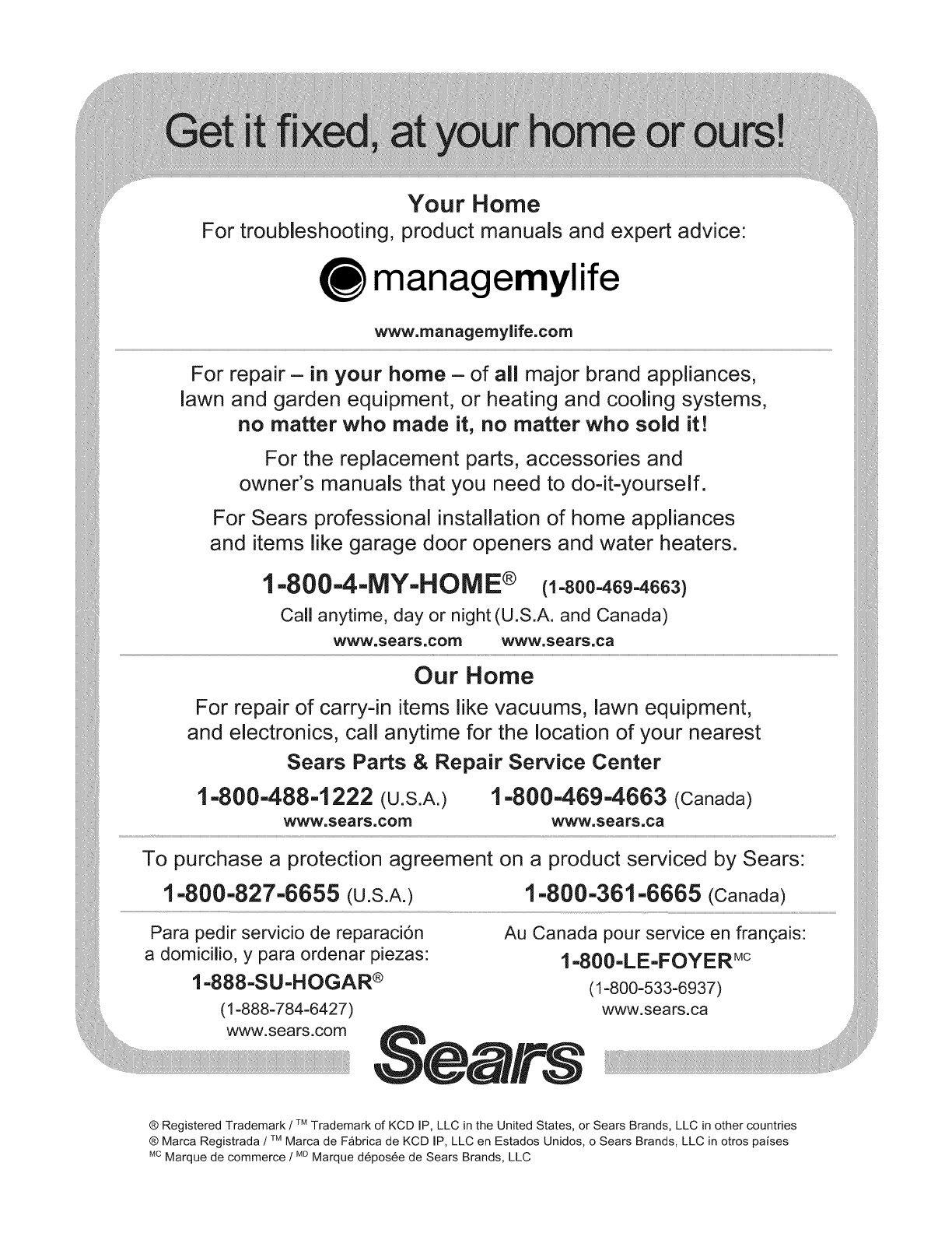 ® Registered Trademark /TMTrademark of KCD IP, LLC in the United States, or Sears Brands, LLC in other countries