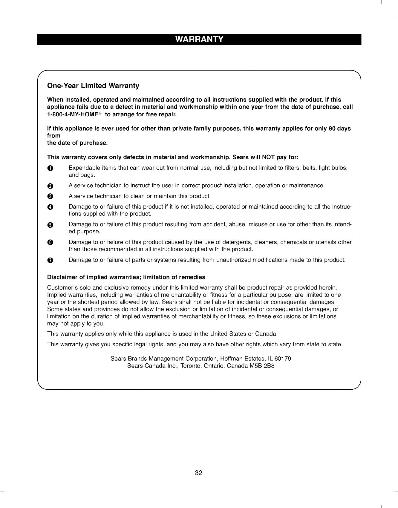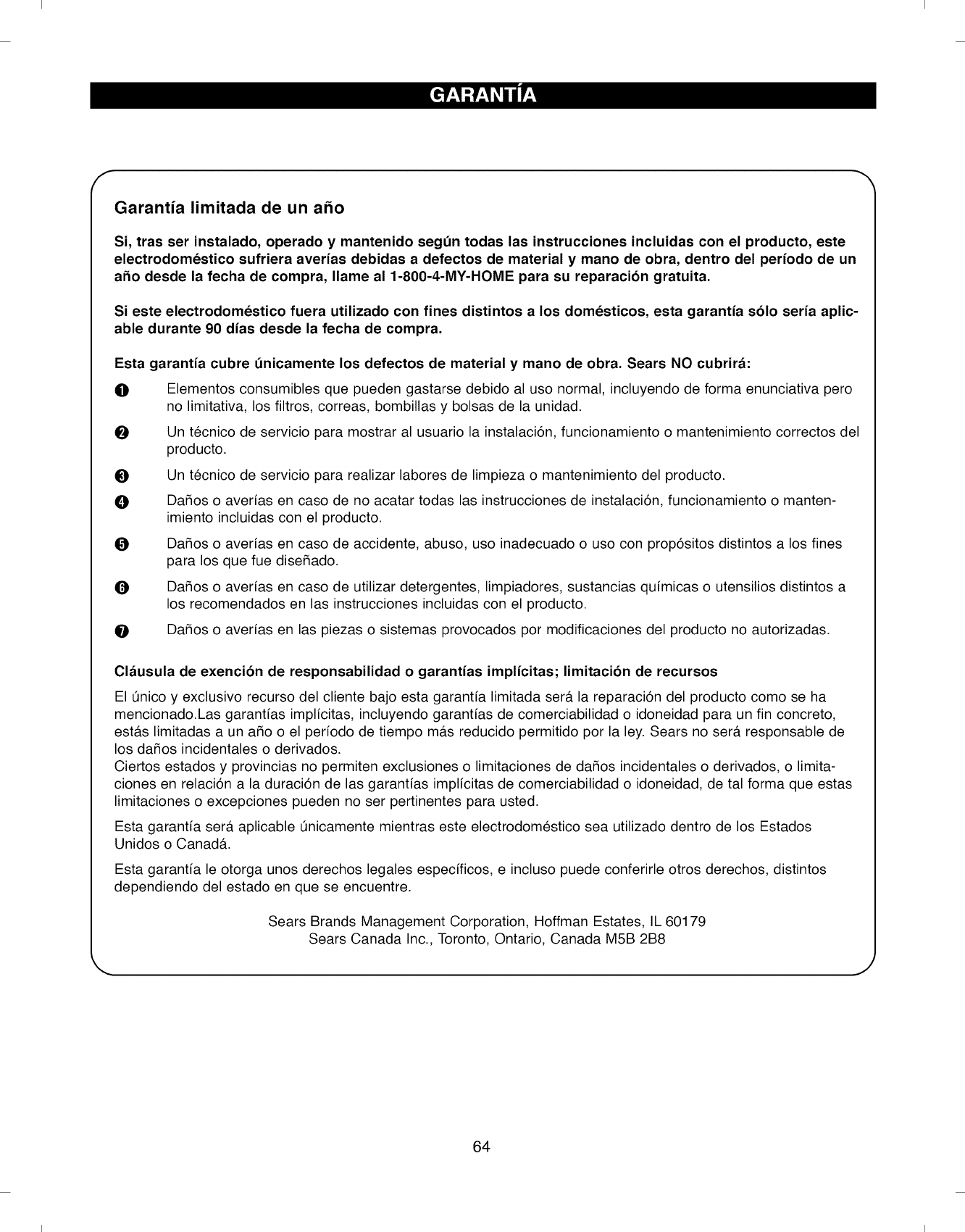 Esta garantia cubre dnicamente los defectos de material y mano de obra. Sears NO cubrird: