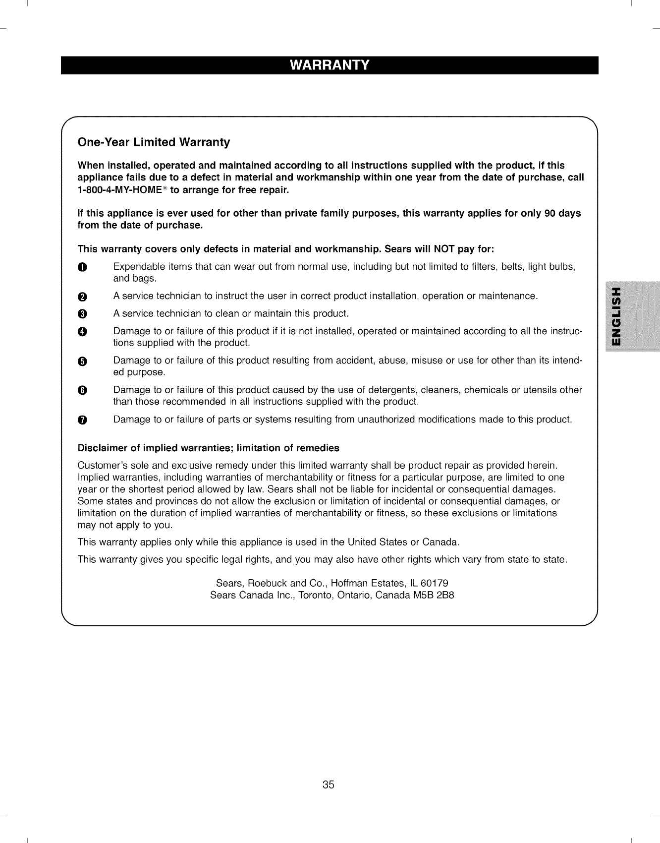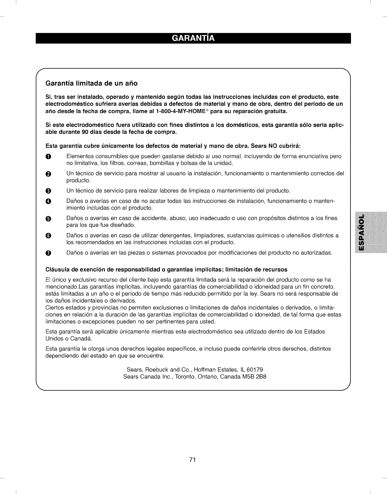 Esta garantia cubre dnicamente los defectos de material y mano de obra. Sears NO cubrird: