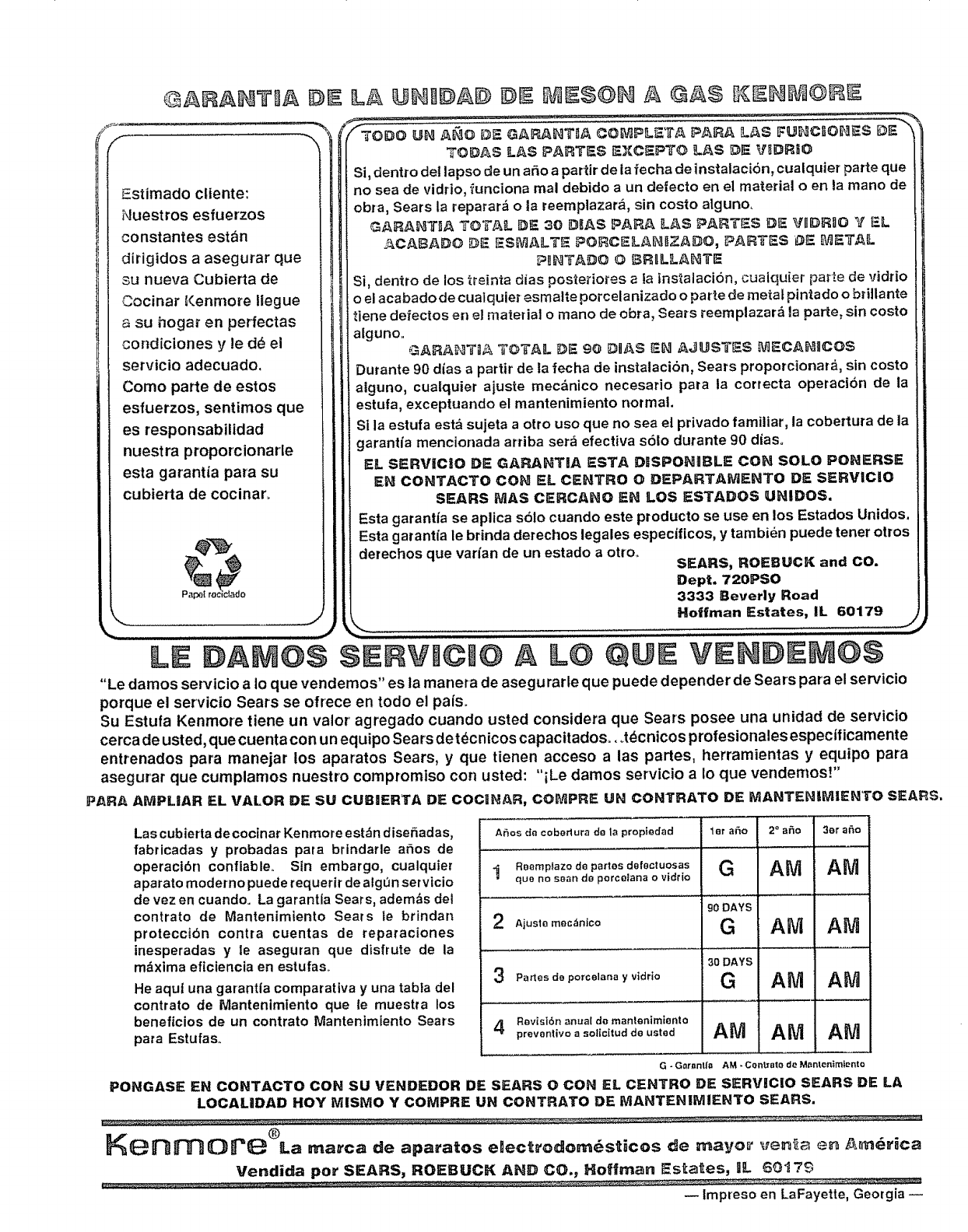 Su Estufa Kenmote tiene un valor agregado cuando usted considera que Sears posee una unidad de servicio