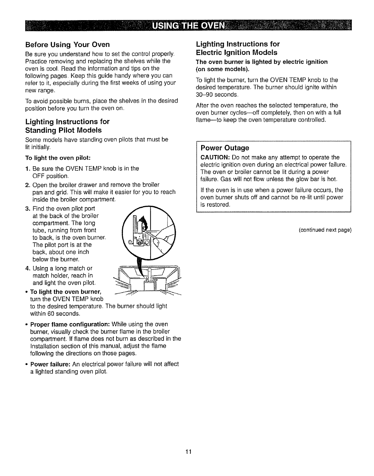 Instructions for Standing Pilot Models section in Using Your Oven.