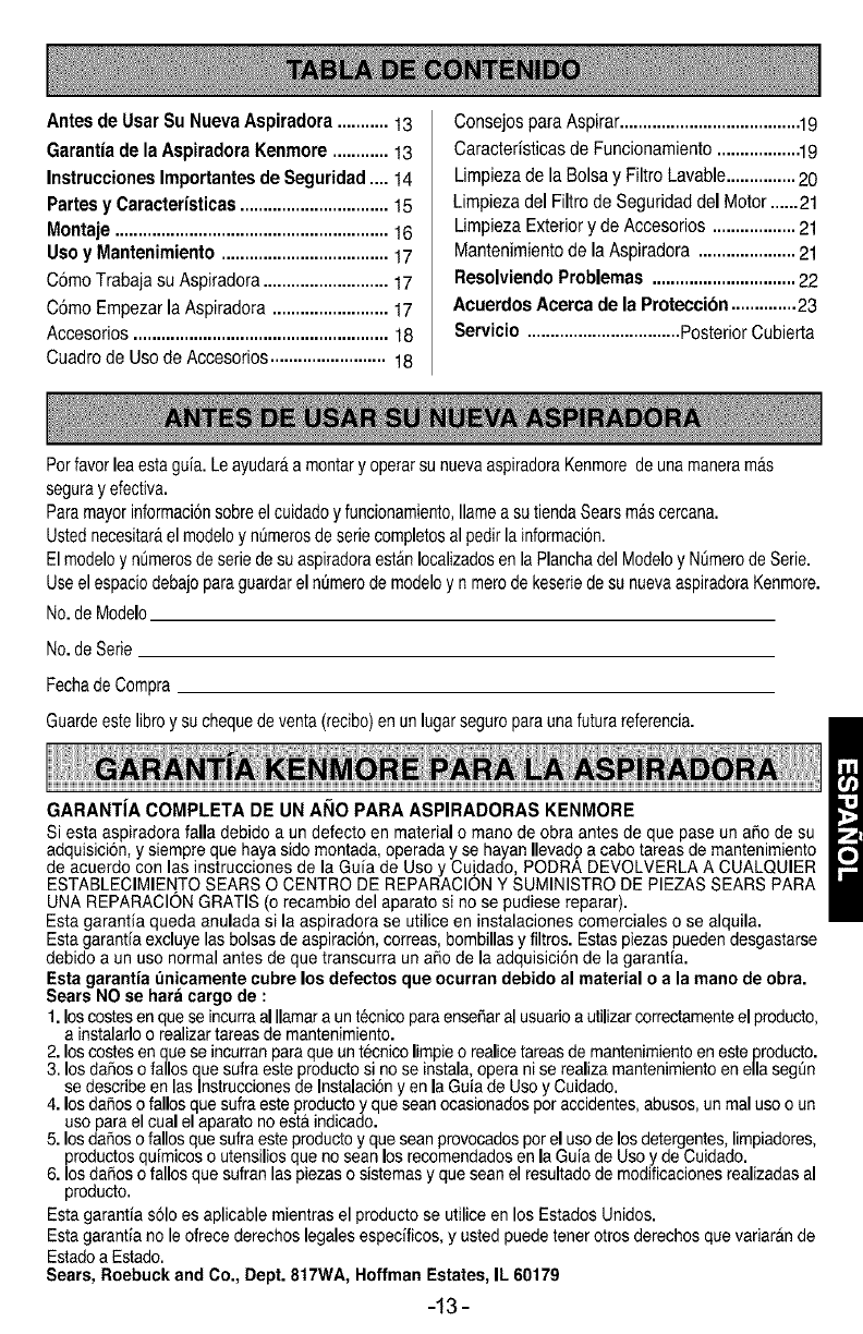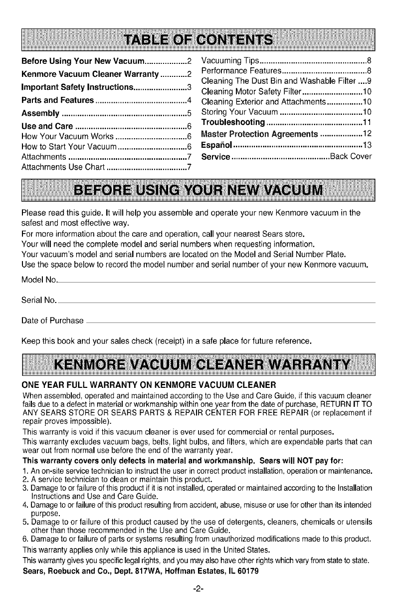 Kenmore Vacuum Cleaner Warranty ............2