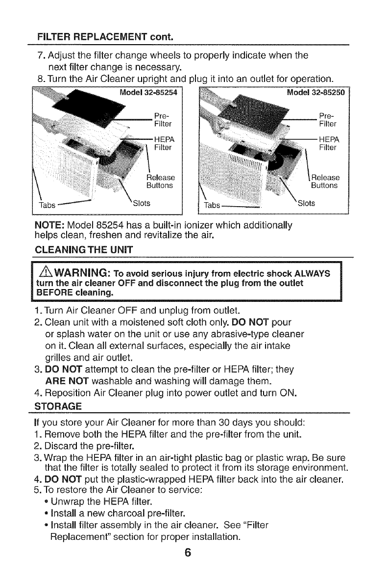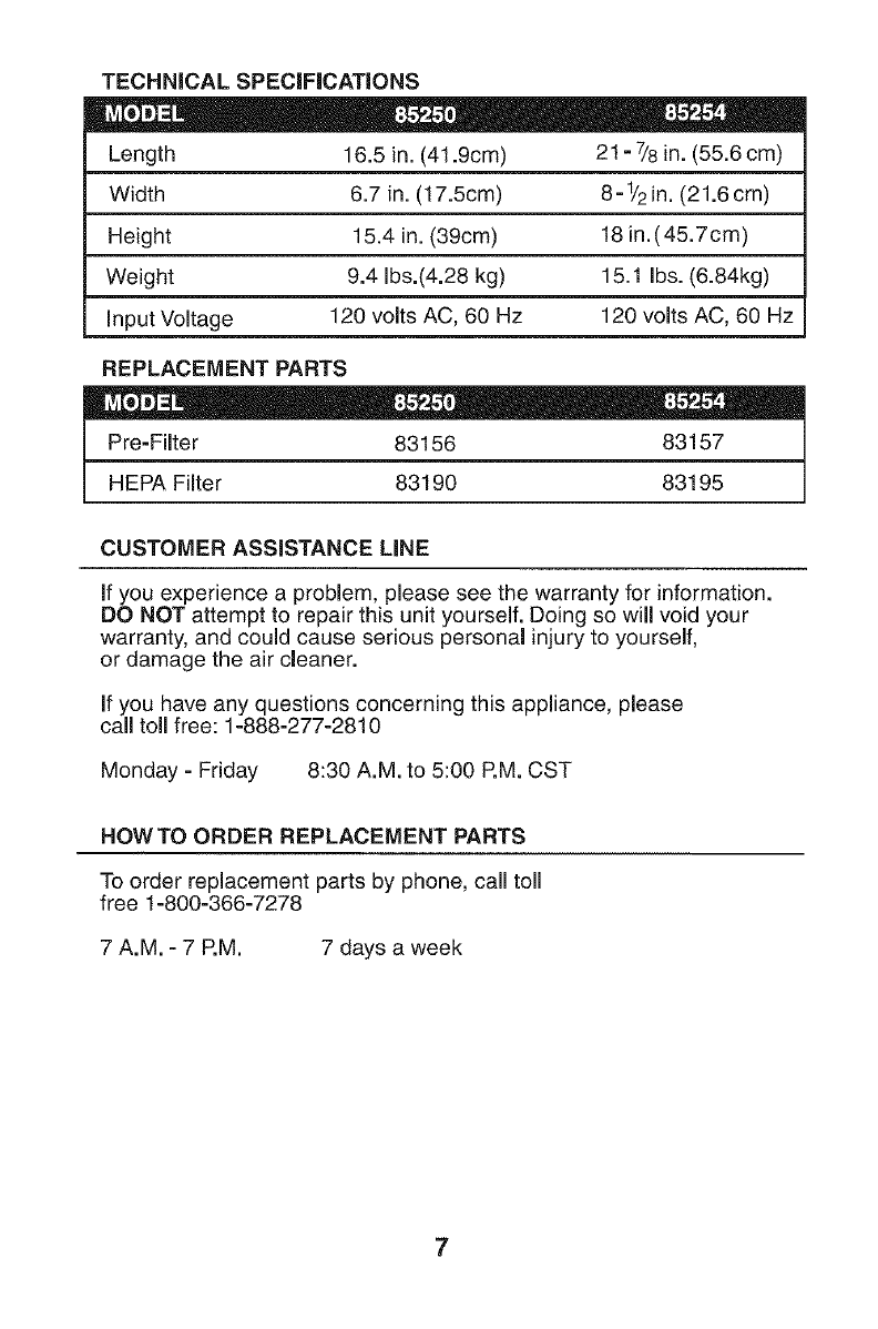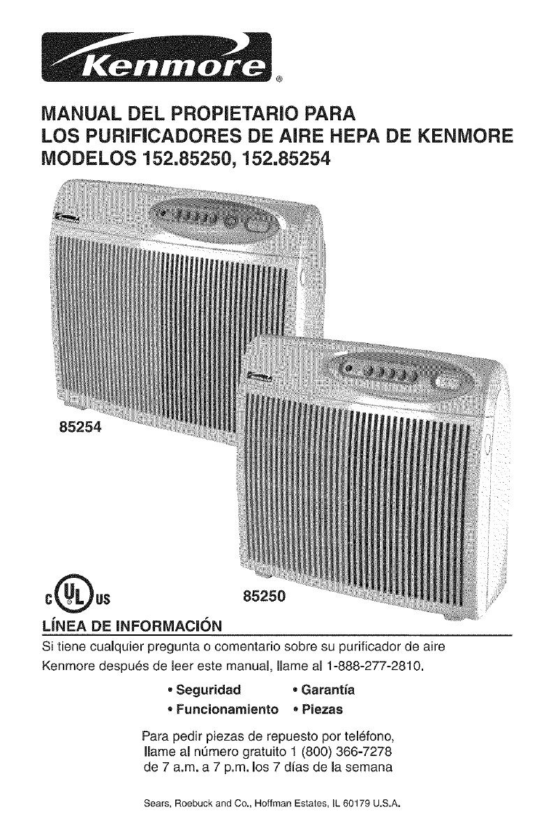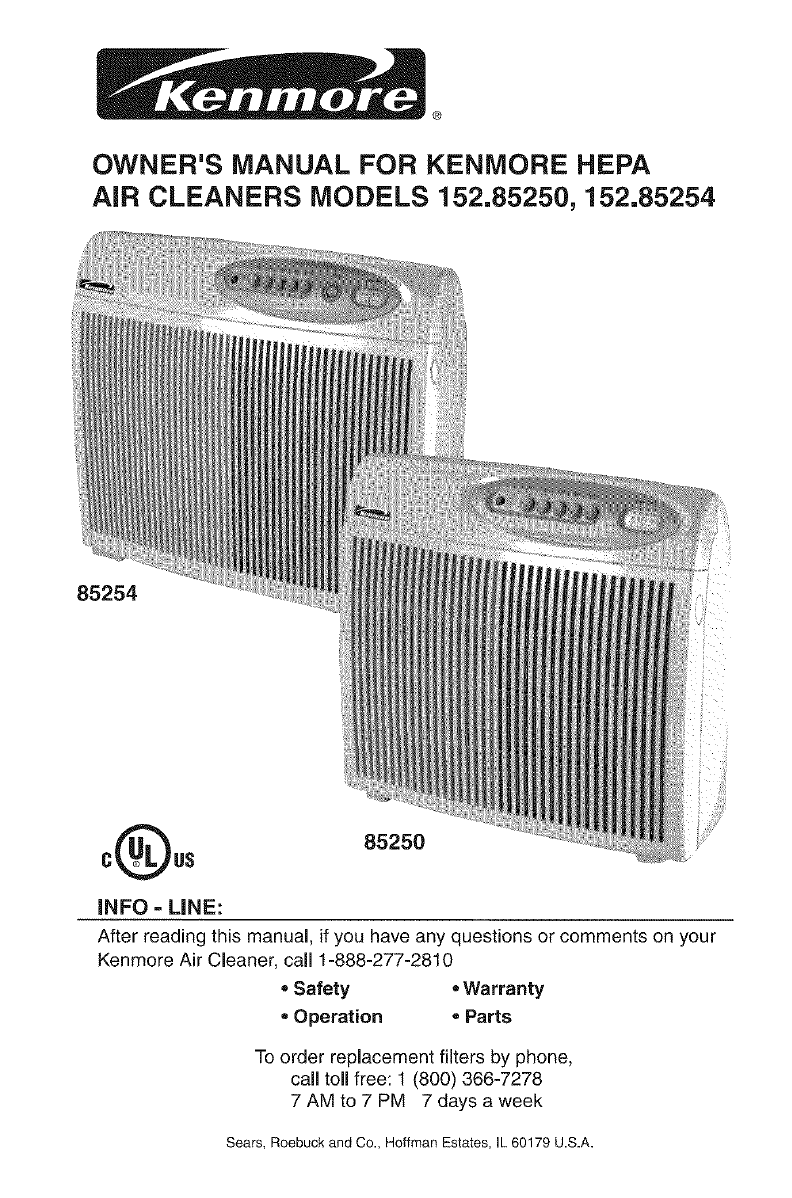 AiR CLEANERS MODELS 152.85250, 152.85254