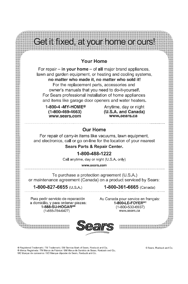 ® Registered Trademark /TM Trademark /SM Service Mark of Sears, Roebuck and Co. @Sears, Roebuck and Co.