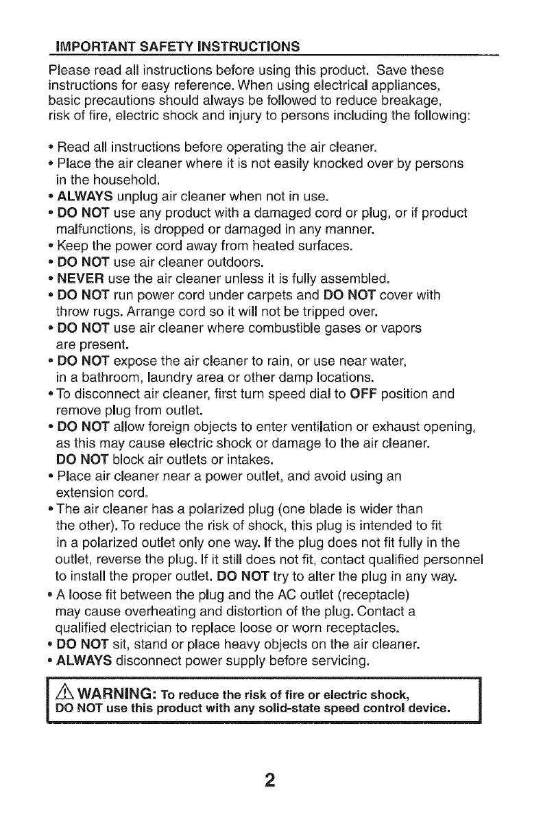 i Z'_ WARNING: T° reduce the risk °f fire °r e'ectr'c sh°ck' iDO NOT use this product with any solid-state speed contro| device.