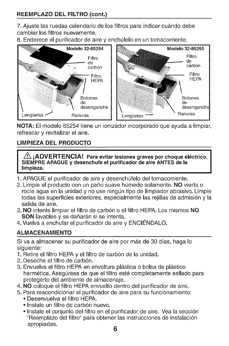 NOTA: El modelo 85254 tiene un ionizador incorporado que ayuda a limpJar,