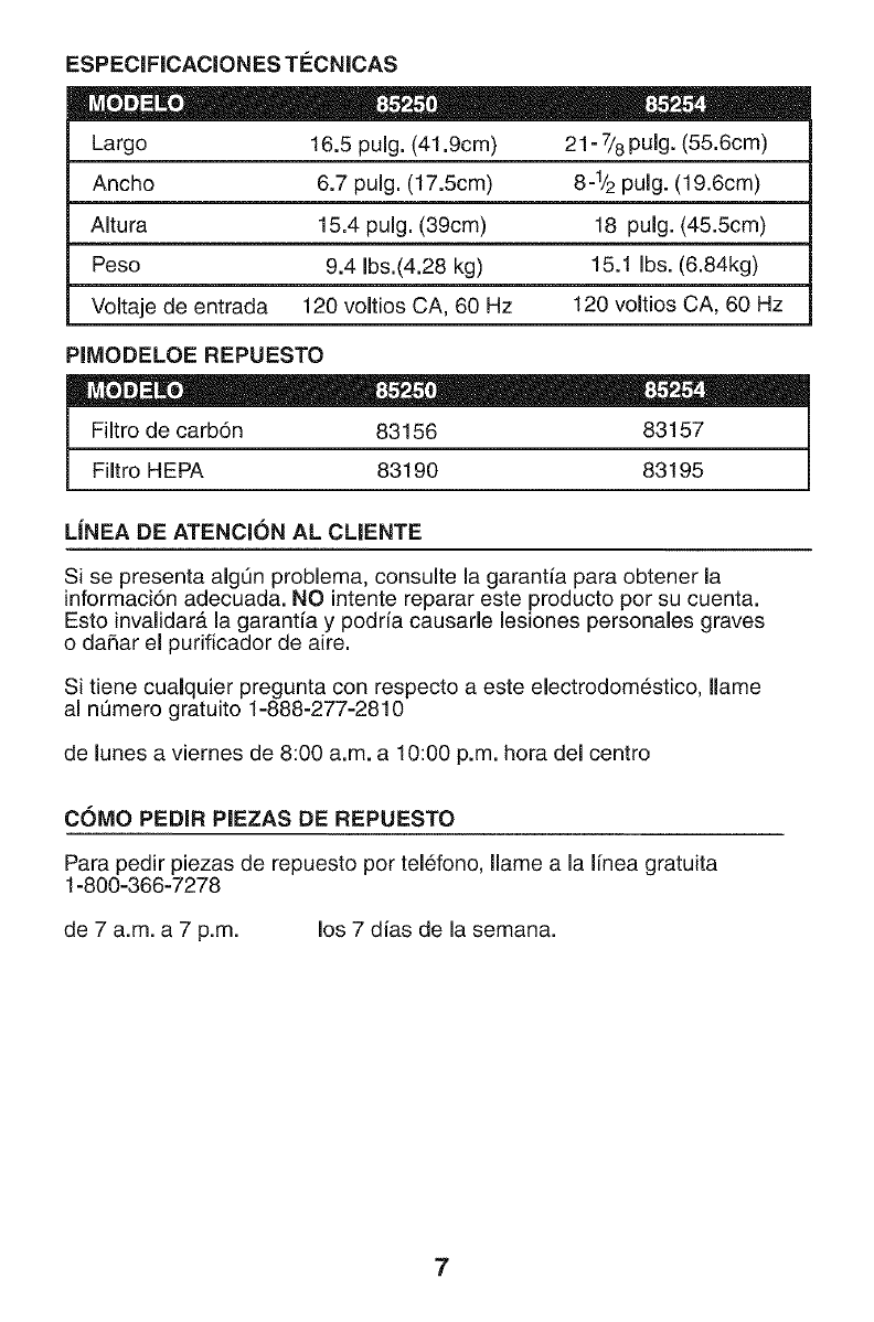 Para pedir piezas de repuesto pot tel_fono, llame ala linea gratuita