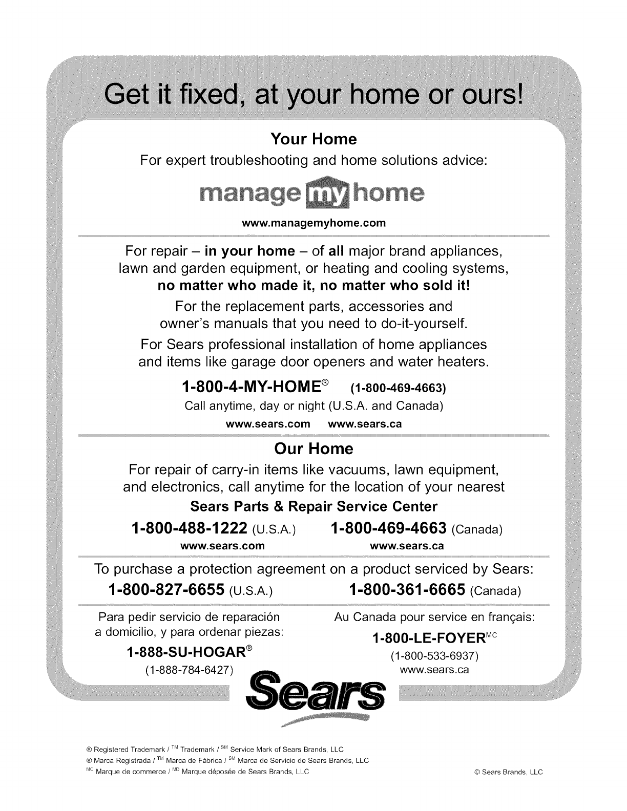 See back cover for other Sears service numbers.