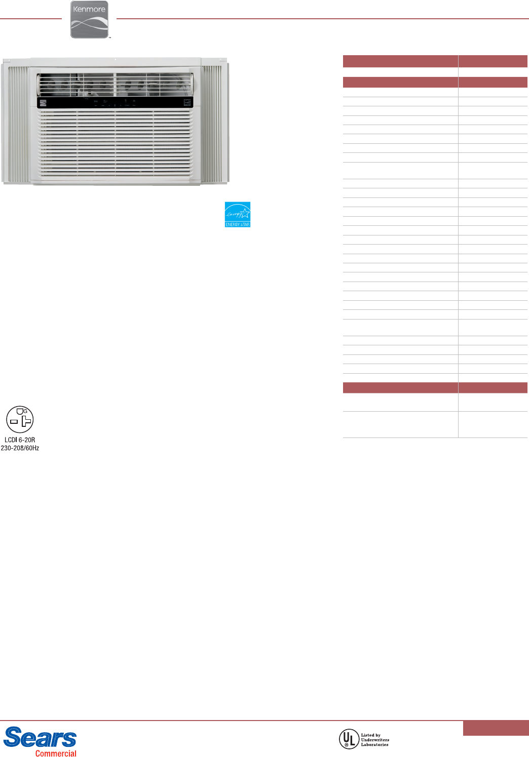Kenmore 25000 Btu Room Air Conditioner Specifications