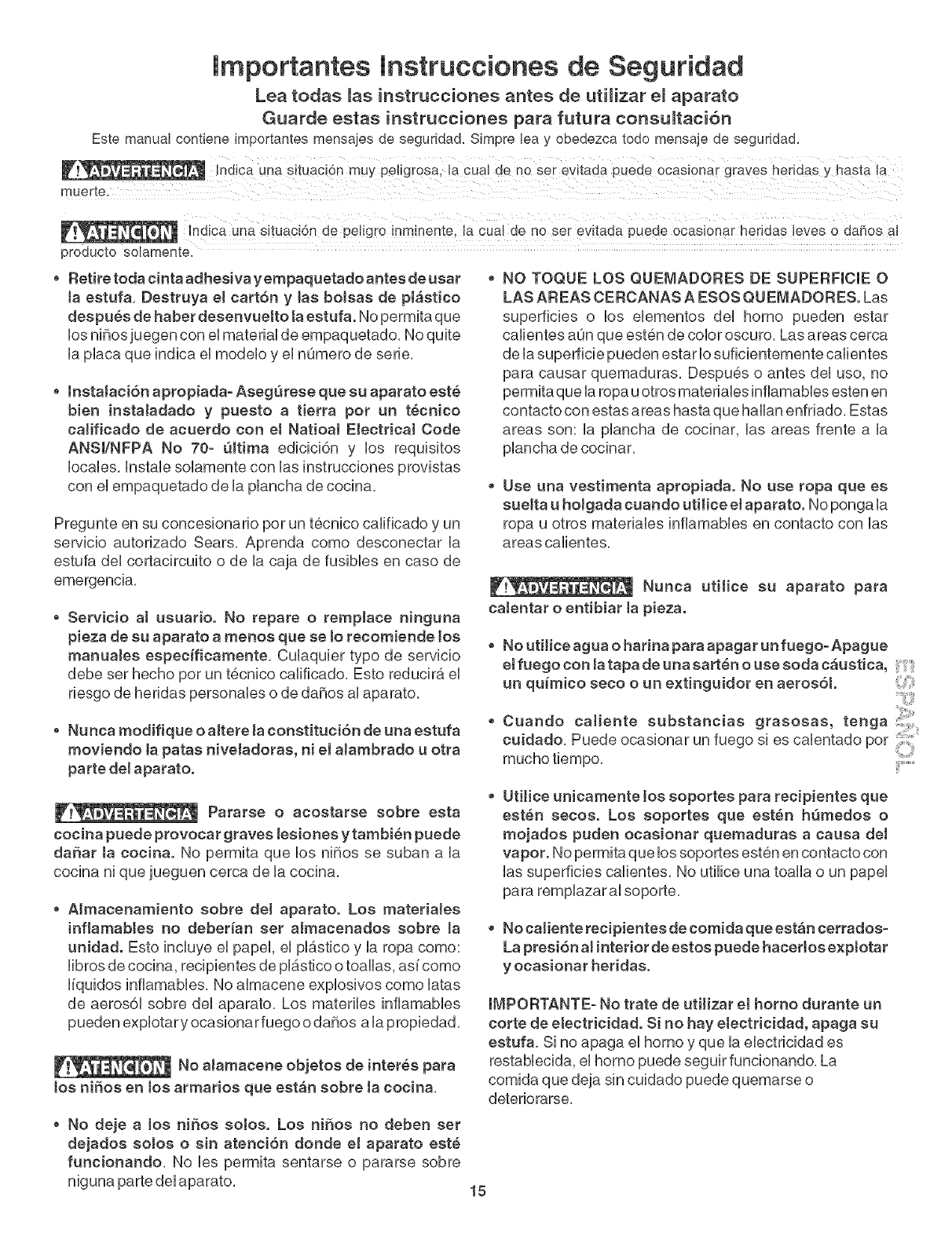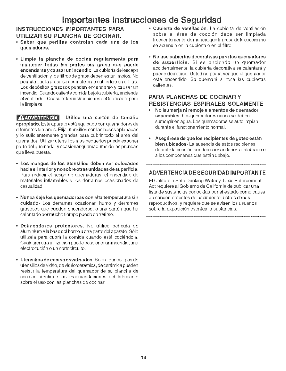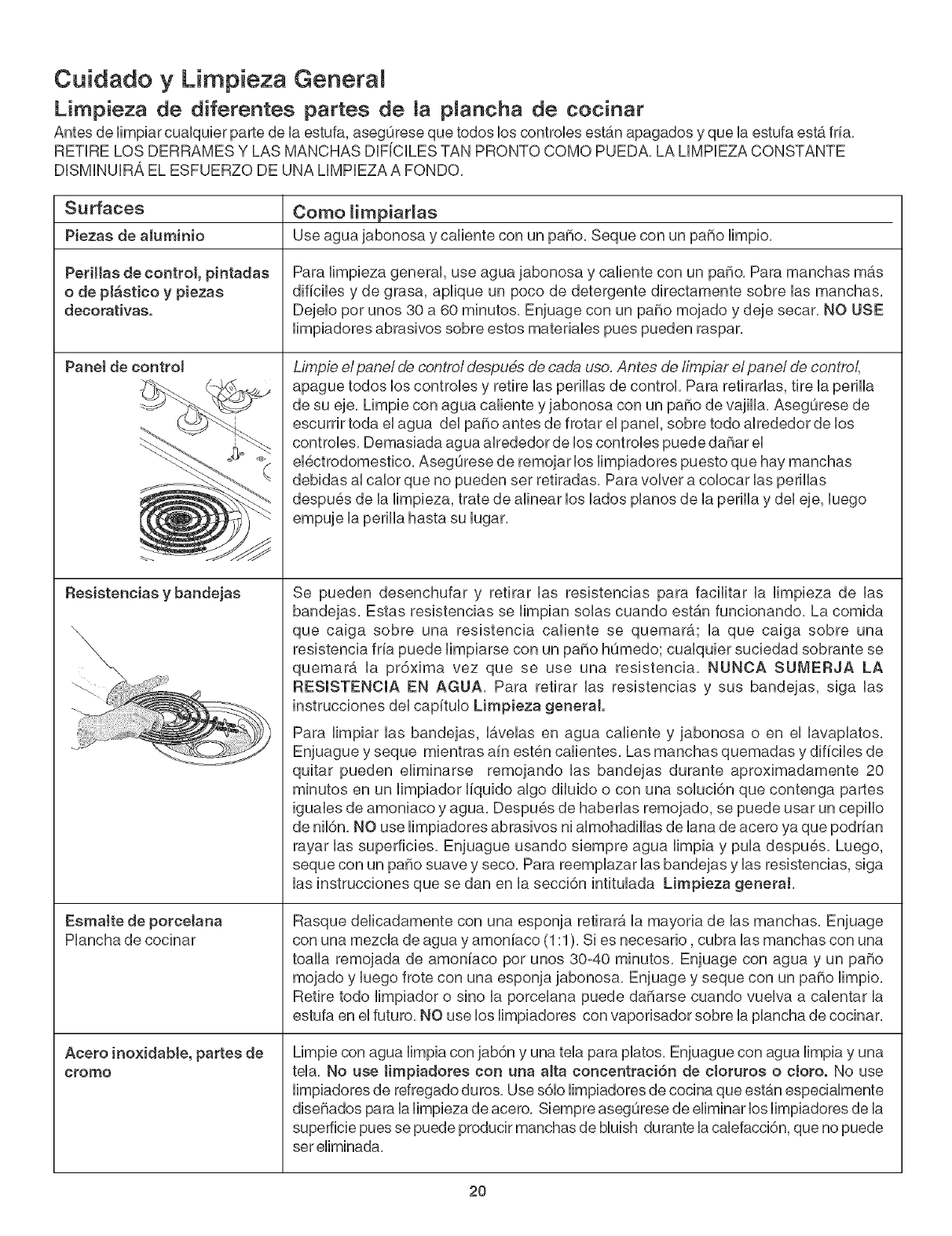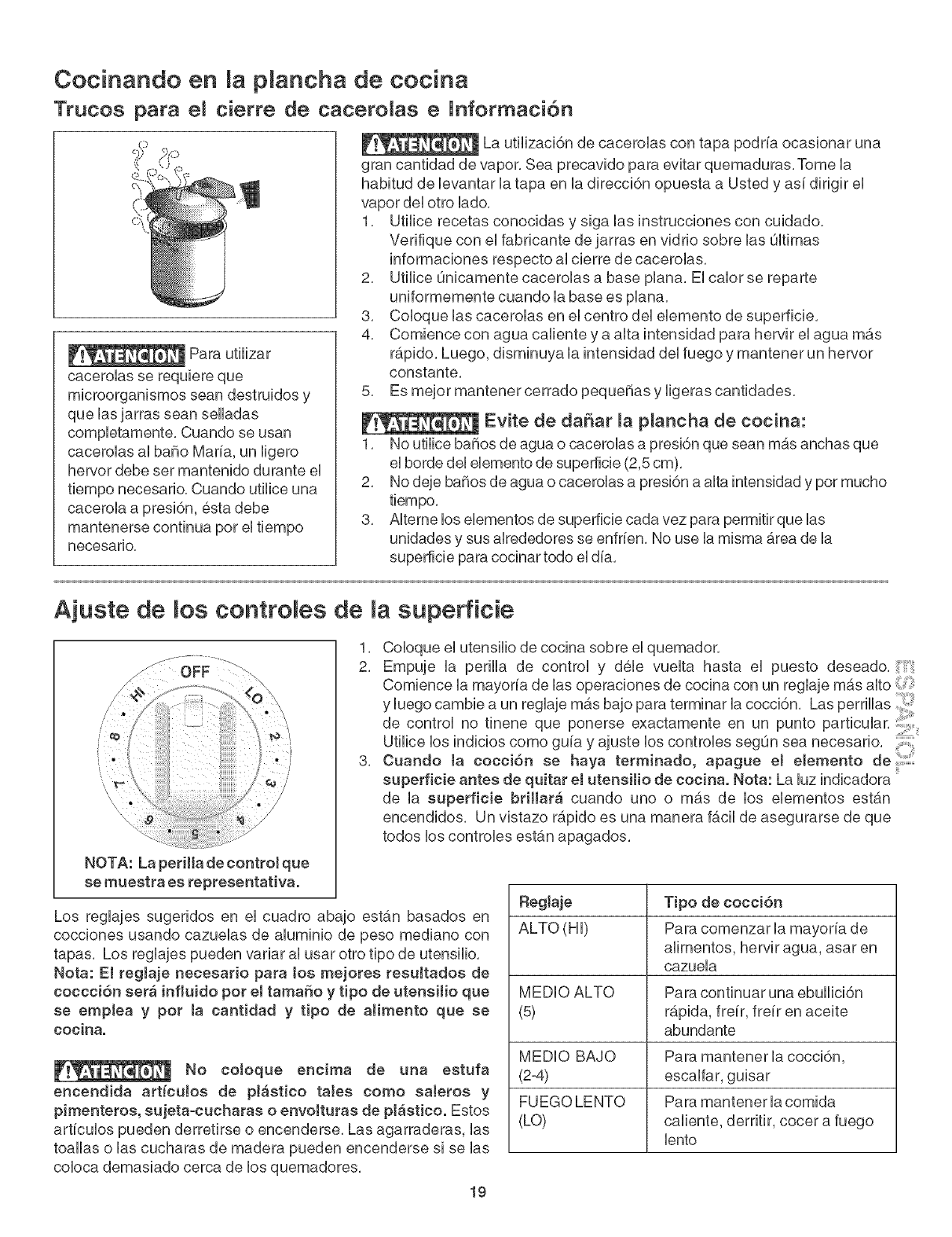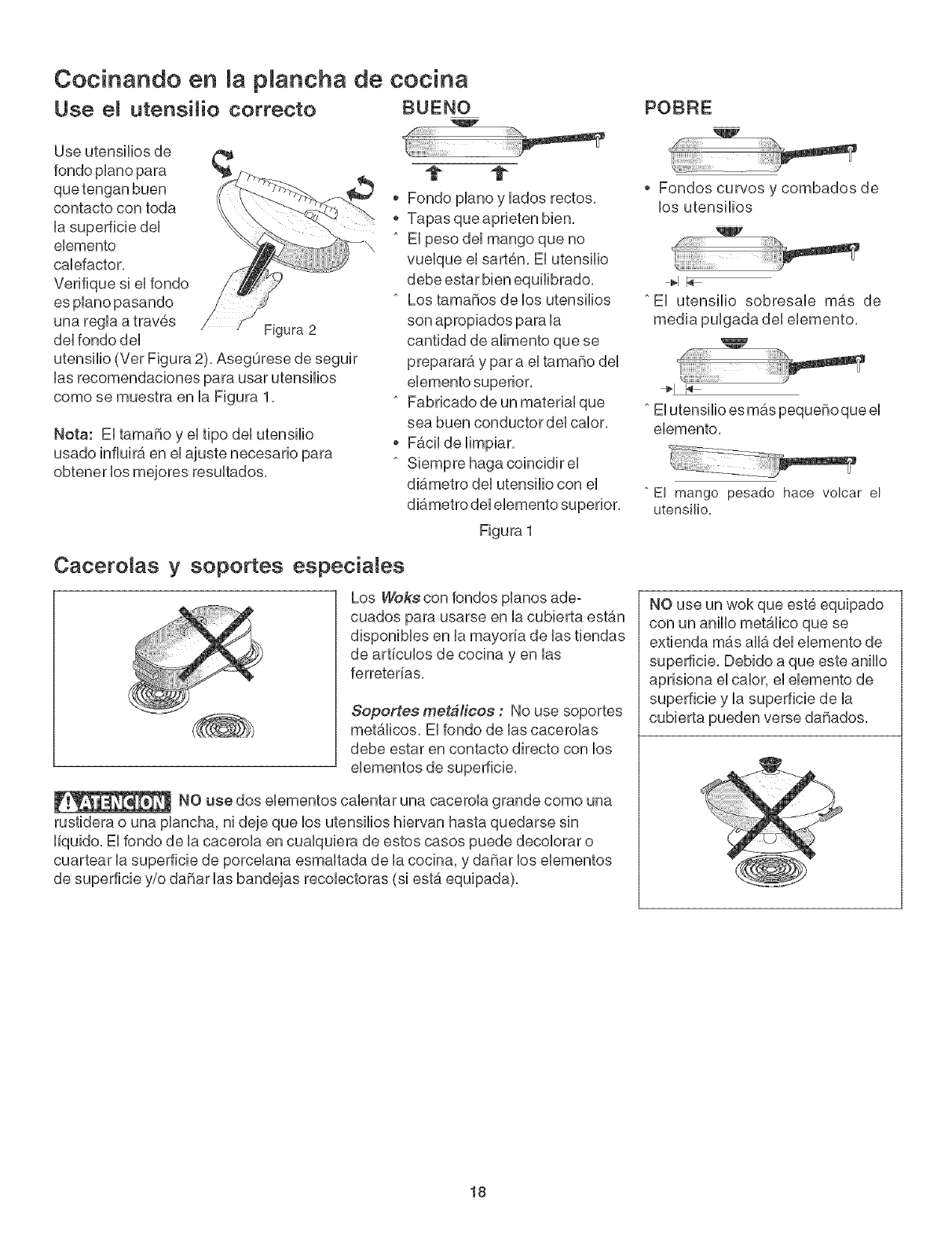 goteos se decoloran, NO utilicie utensilios de este tipo, El tama_o del utensilio debe coincidir