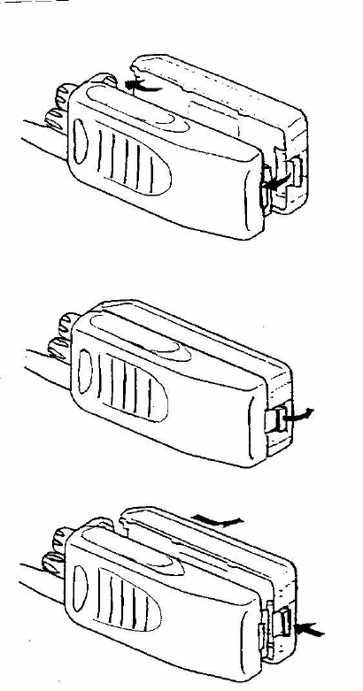 1 Match the guides of the battery pack with the corresponding grooves on the upper rear of the transceiver, then firmly