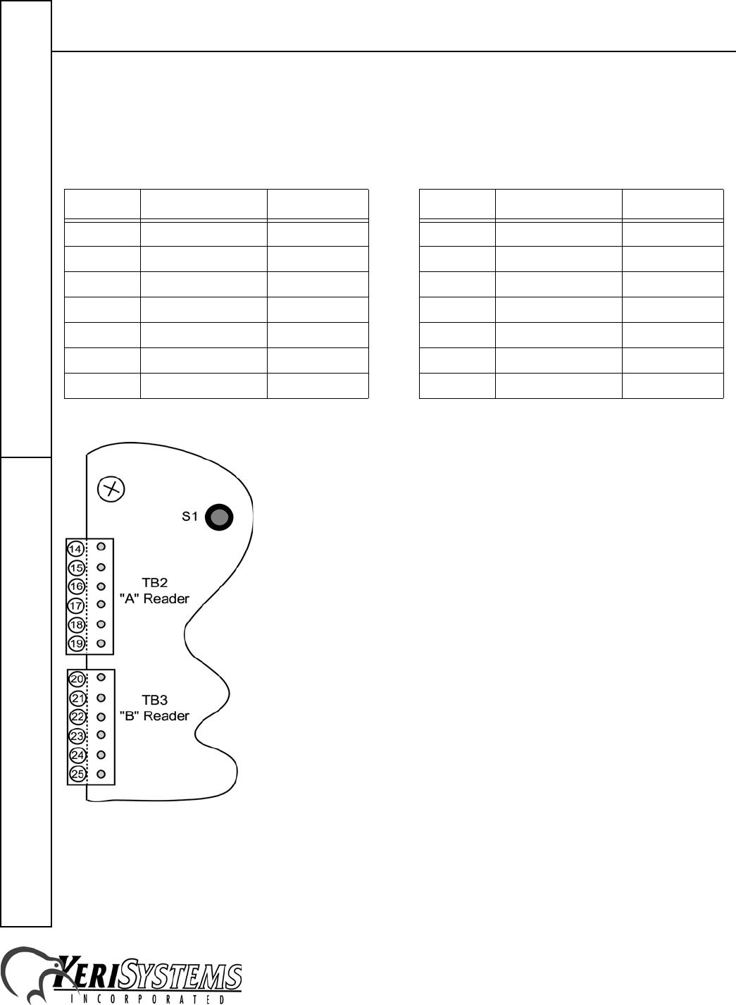 The "A" reader connects to TB2, pins 14 through 19. The "B" reader to TB3, pins 20 through 25.