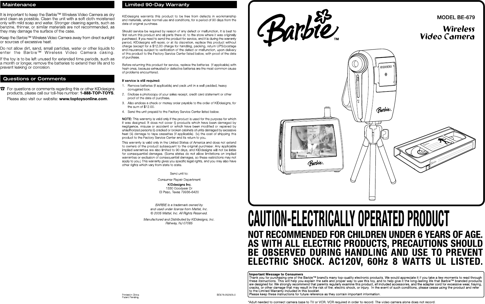 Kiddesigns BE679 Barbie Wireless Video Camera User Manual manual
