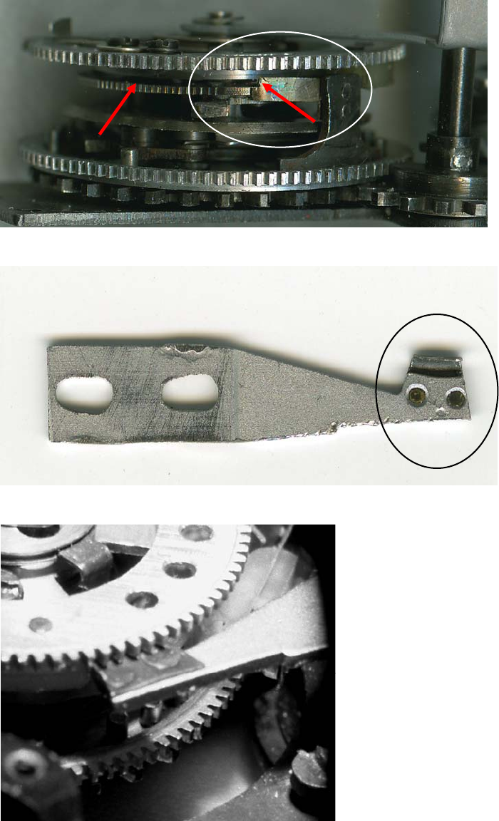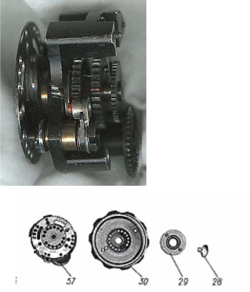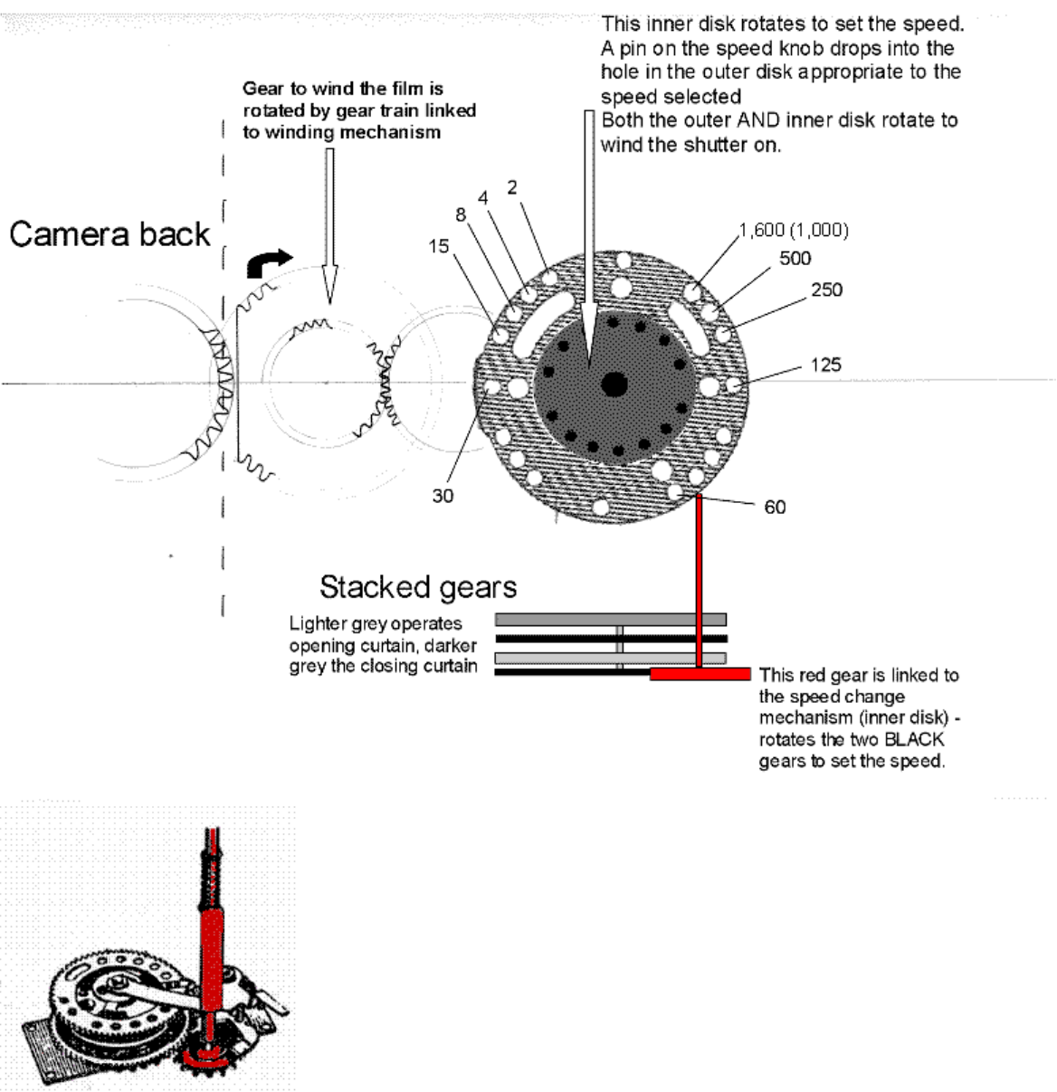 the upper toothed gear. This sprung clip holds the stacked gears together when the shutter is advanced. It is then