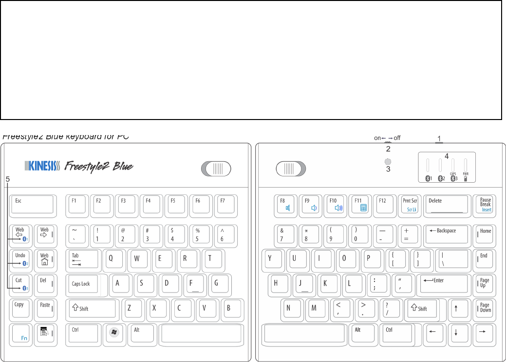 The figure below shows the layout of the keys, with special Bluetooth features identified by numbers. Familiarize yourself briefly with these