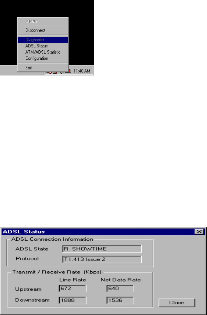 The Modem Icon Utility will allow the user to monitor the ADSL modem's connection and