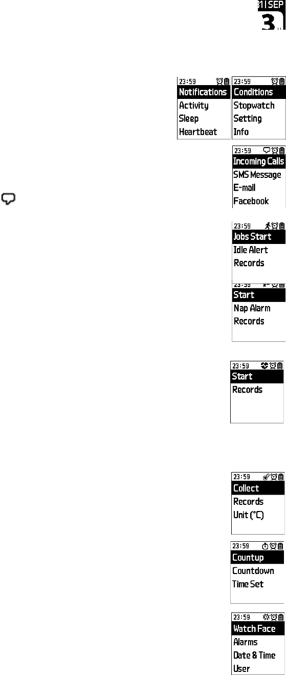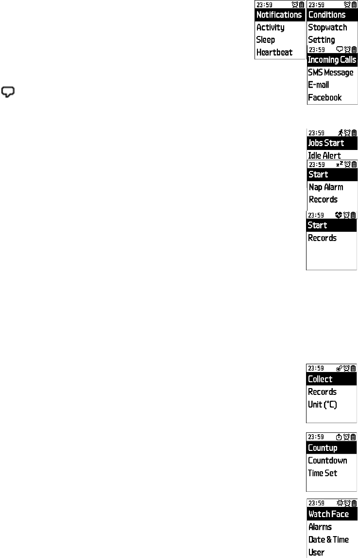 Sleep, Heart rate, Conditions, Stopwatch, Setting and Info. Press UP and