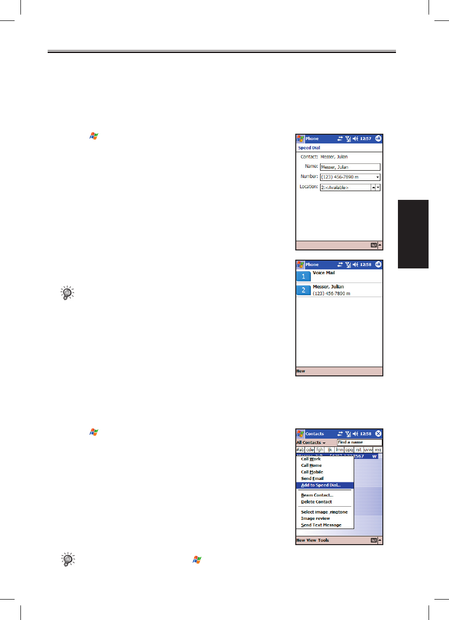 • To delete a speed dial entry, tap → Phone → Speed Dial, tap and hold the contact name in