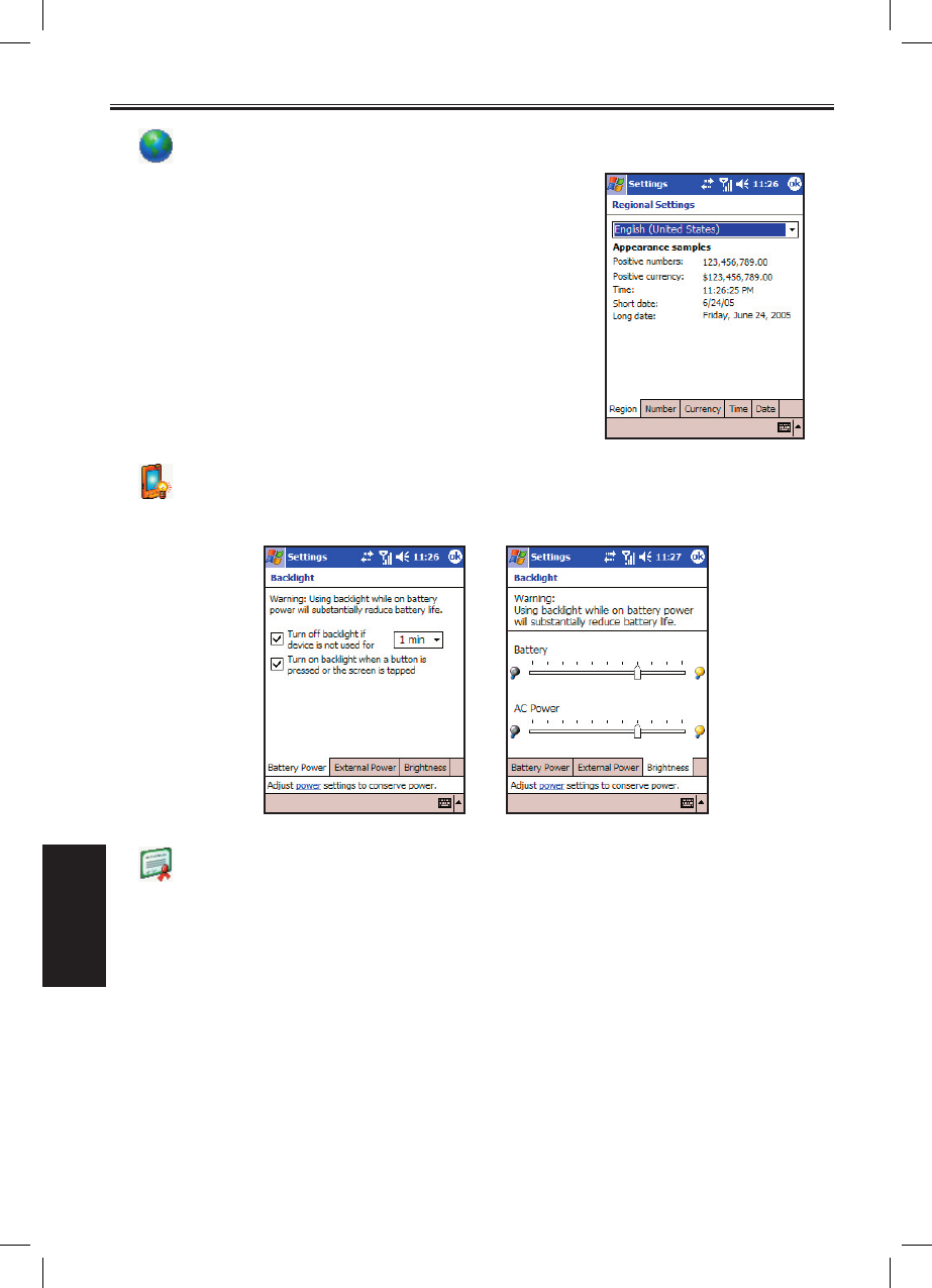 This item adjusts the brightness of the display and sets the automatic turnoff for power saving purposes.