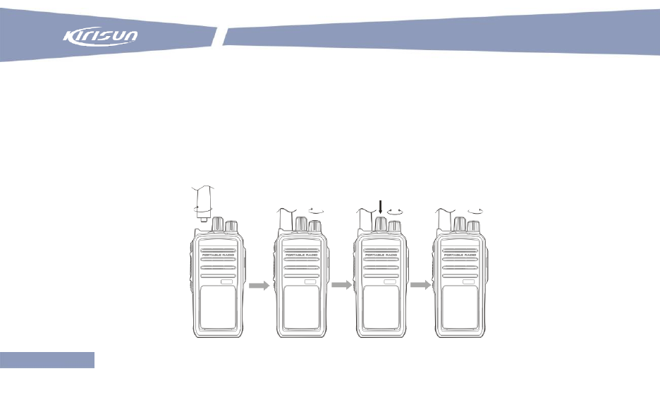 1.Attaching the antenna: Put the antenna into the antenna interface, and rotate the antenna clockwise to fix it.
