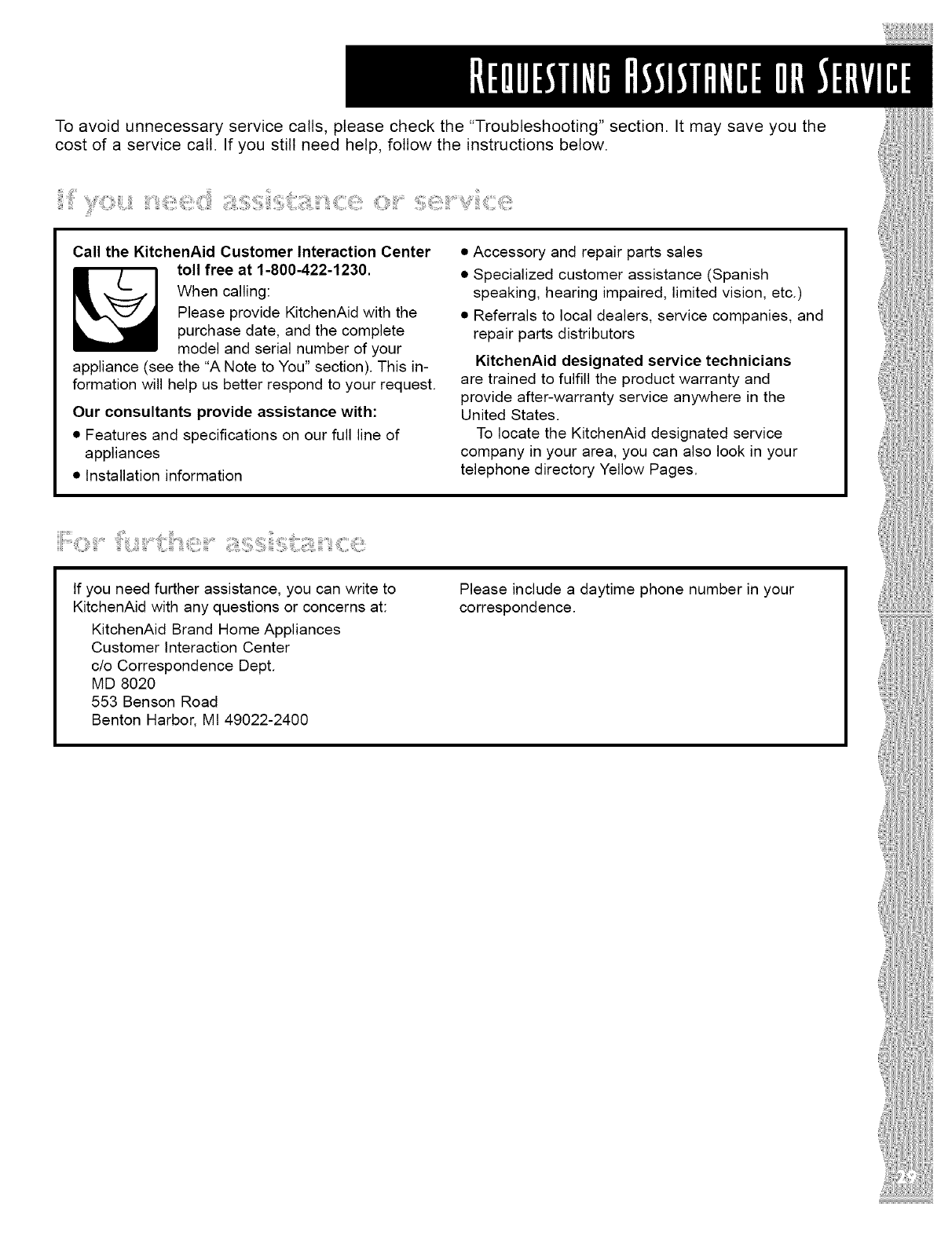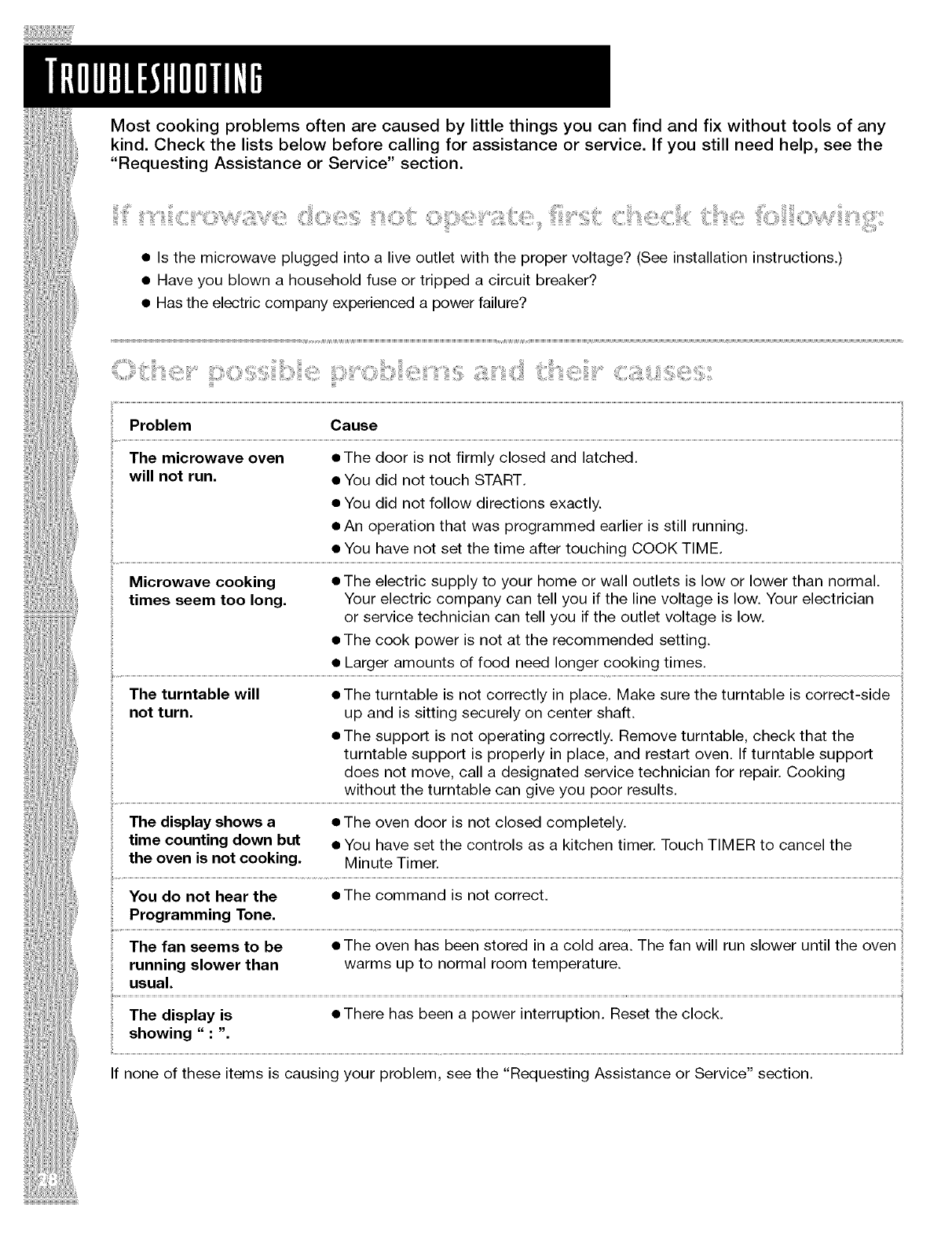 "Troubleshooting," additional help can be found by checking the "Requesting Assistance or Service"