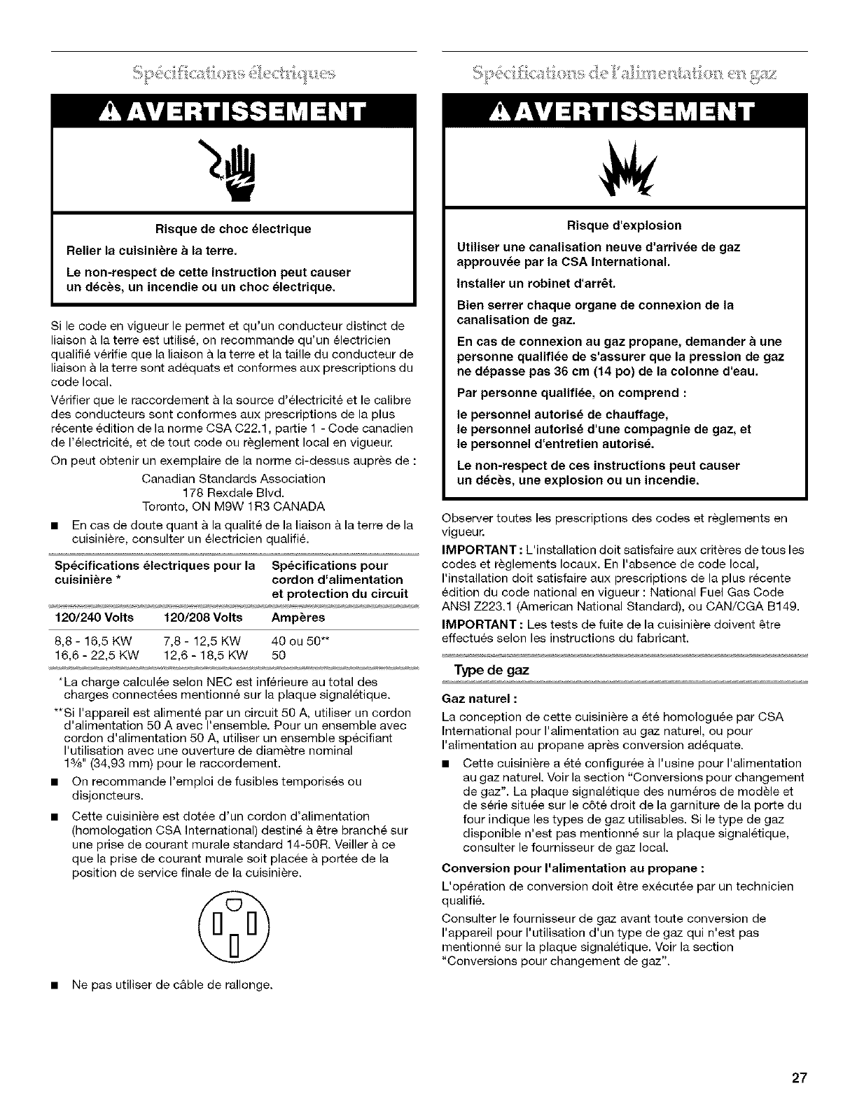 Specifications de I'alimentation en gaz ..................................... 27