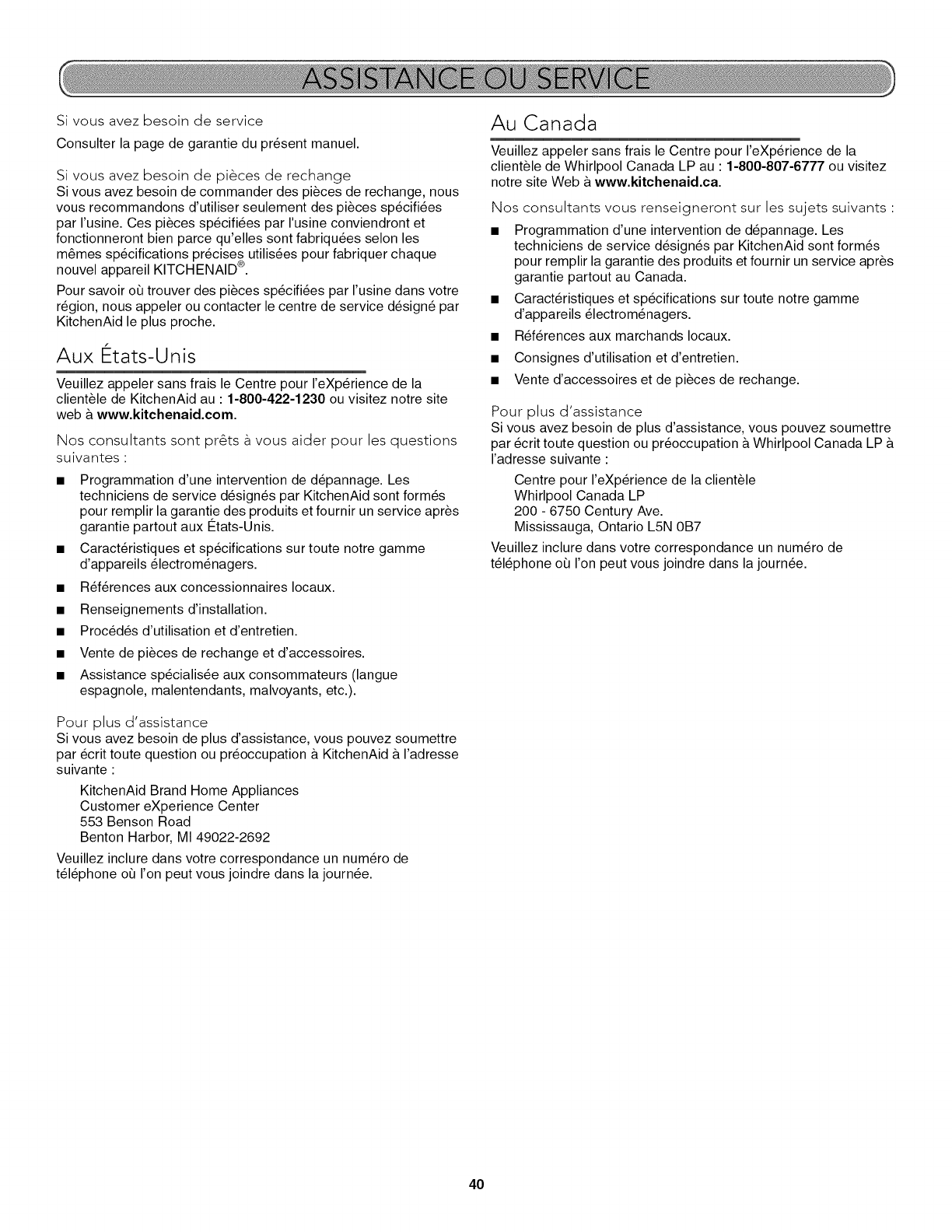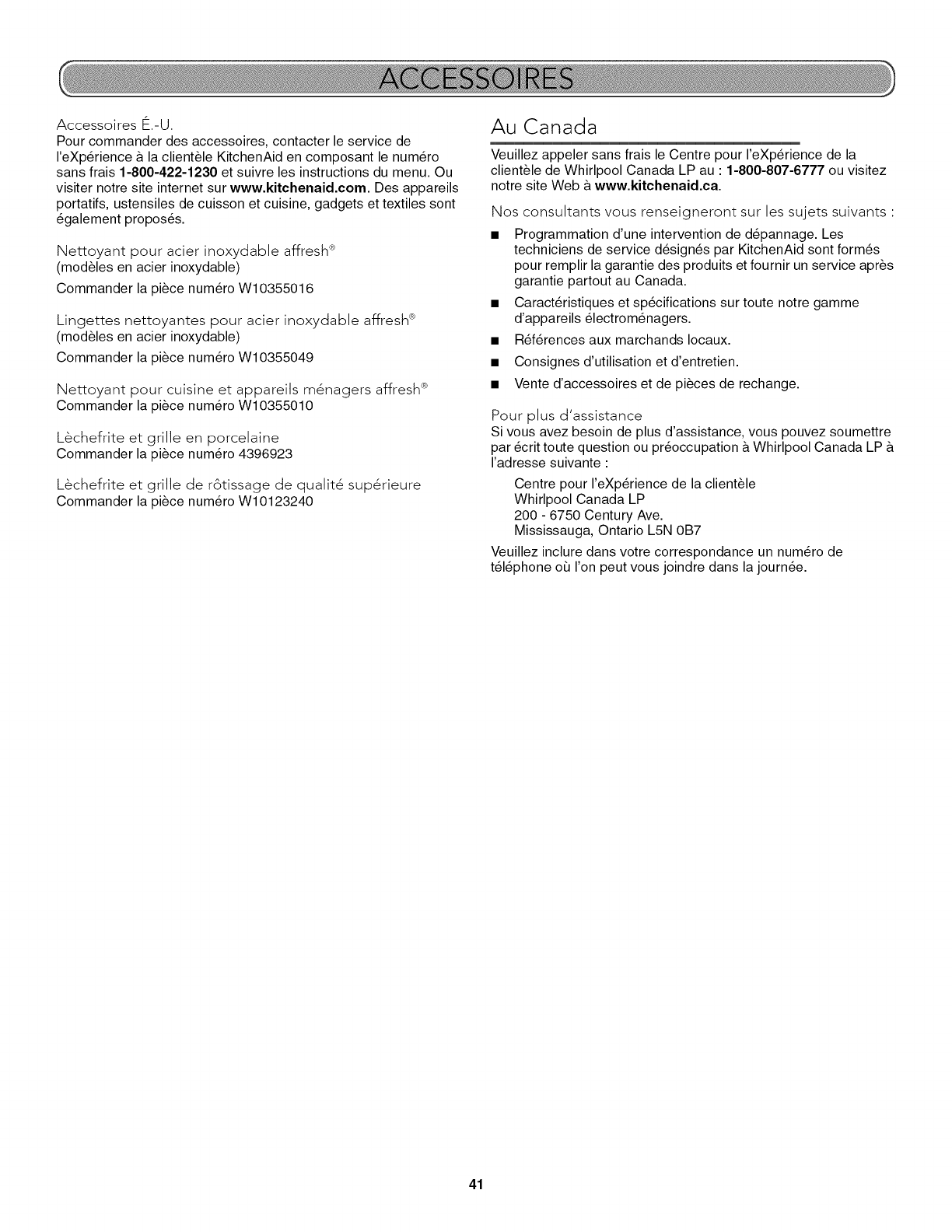 KitchenAid paiera pour les pieces de rechange specifi6es par rusine
