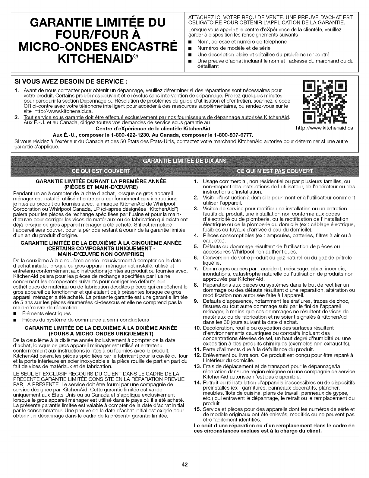 garantie limitee fournie avec ce gros appareil menager, adressez-vous & KitchenAid ou & votre detaillant pour obtenir les modalites d'achat d'une