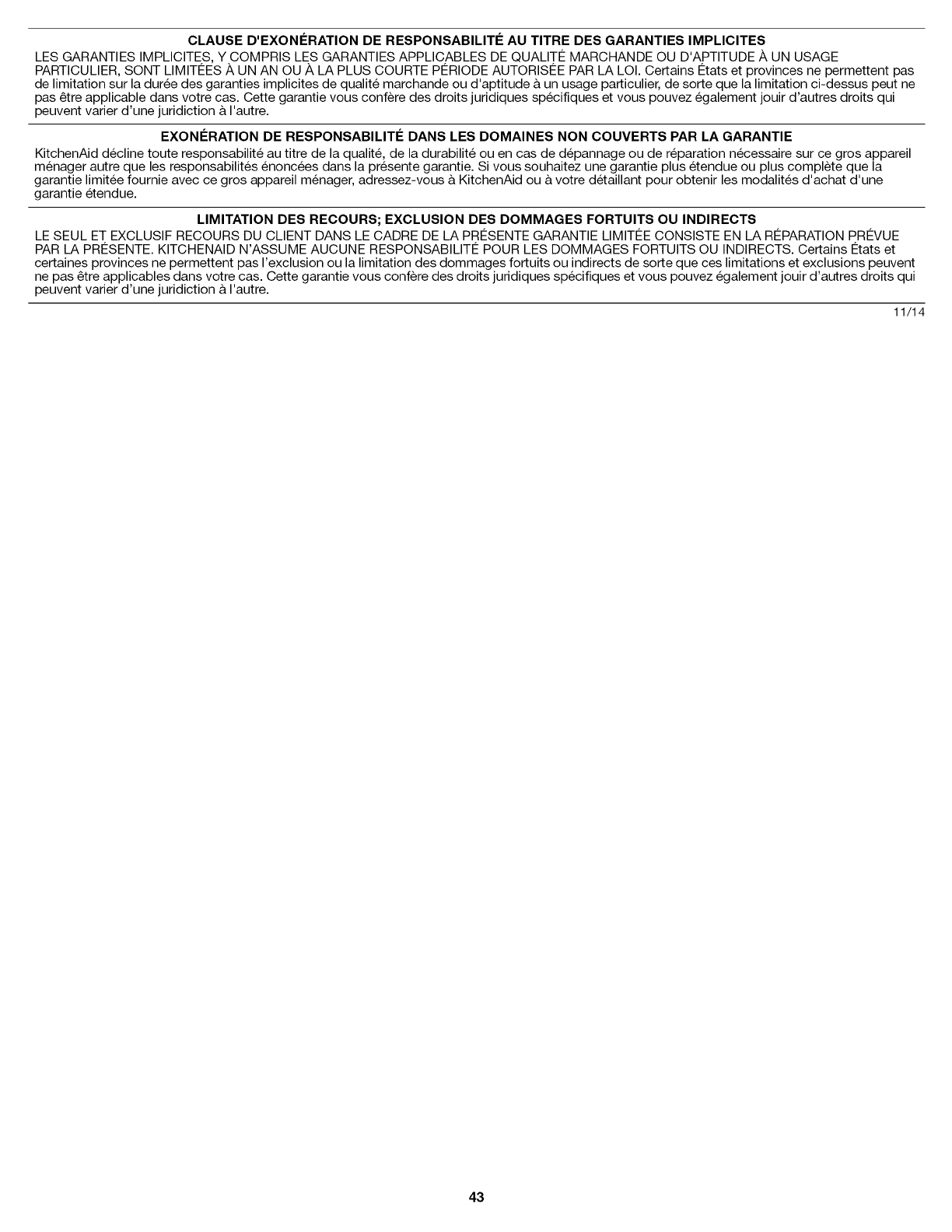 PAR LA PRESENTE. KITCHENAID N'ASSUME AUCUNE RESPONSABILITF t POUR LES DOMMAGES FORTUITS OU INDIRECTS. Certains Fttats et