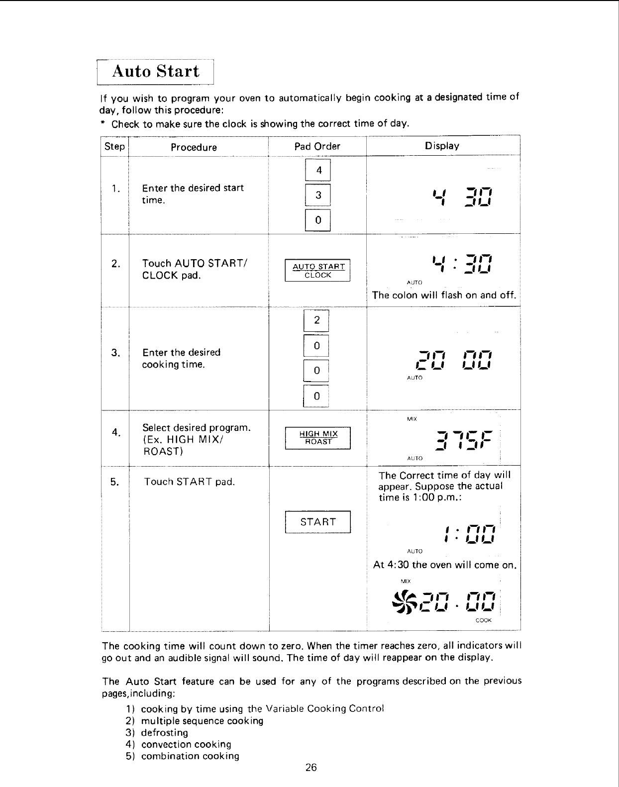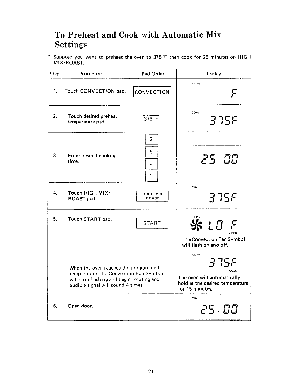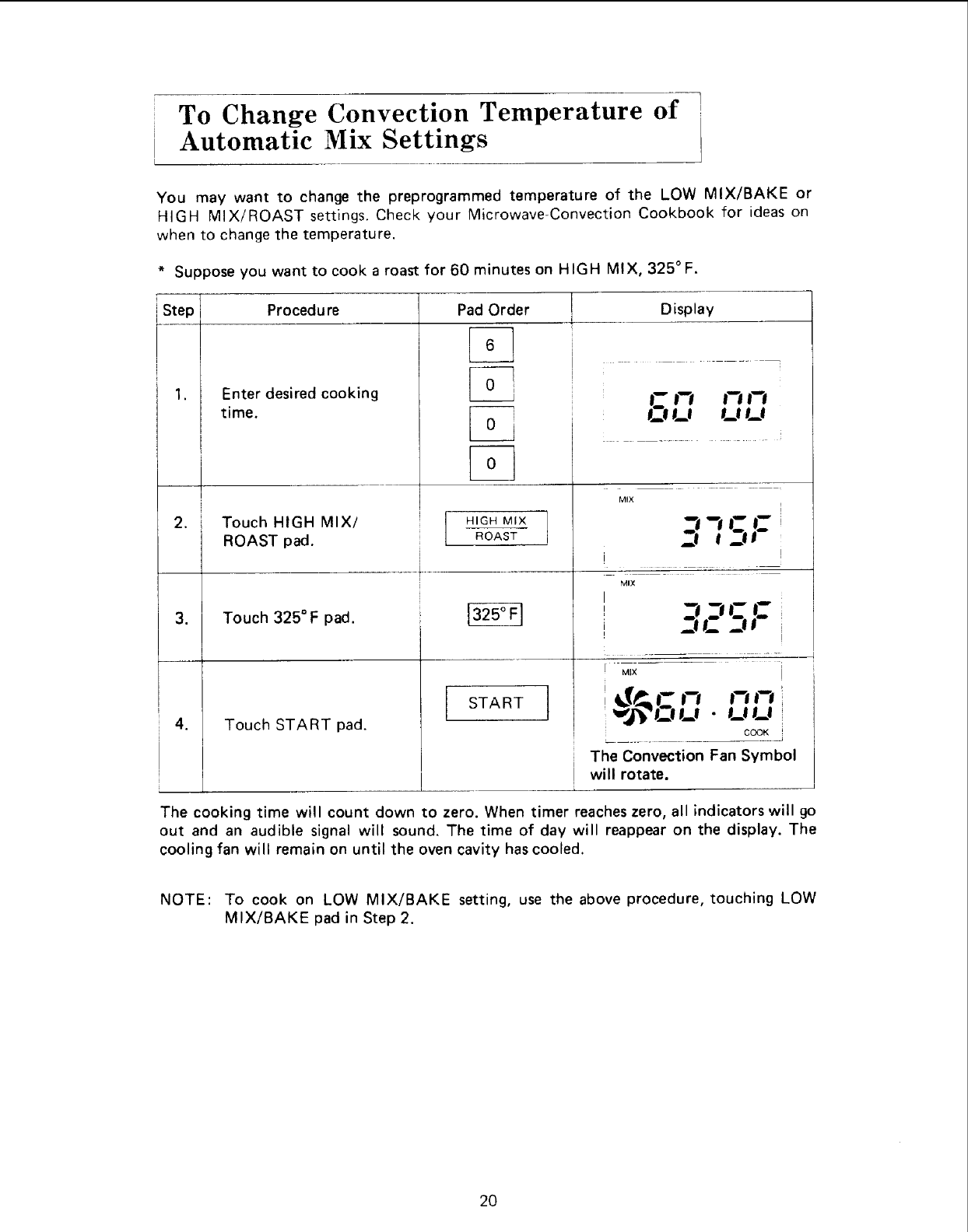 4. Program oven for appropriate cooking time and mix setting. Change temperature if