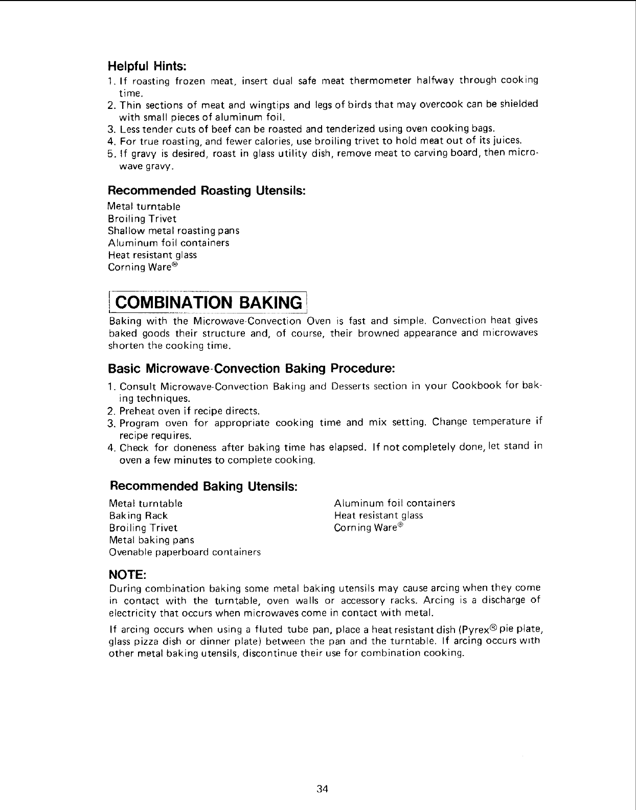 During combination baking some metal baking utensils may cause arcing when they come
