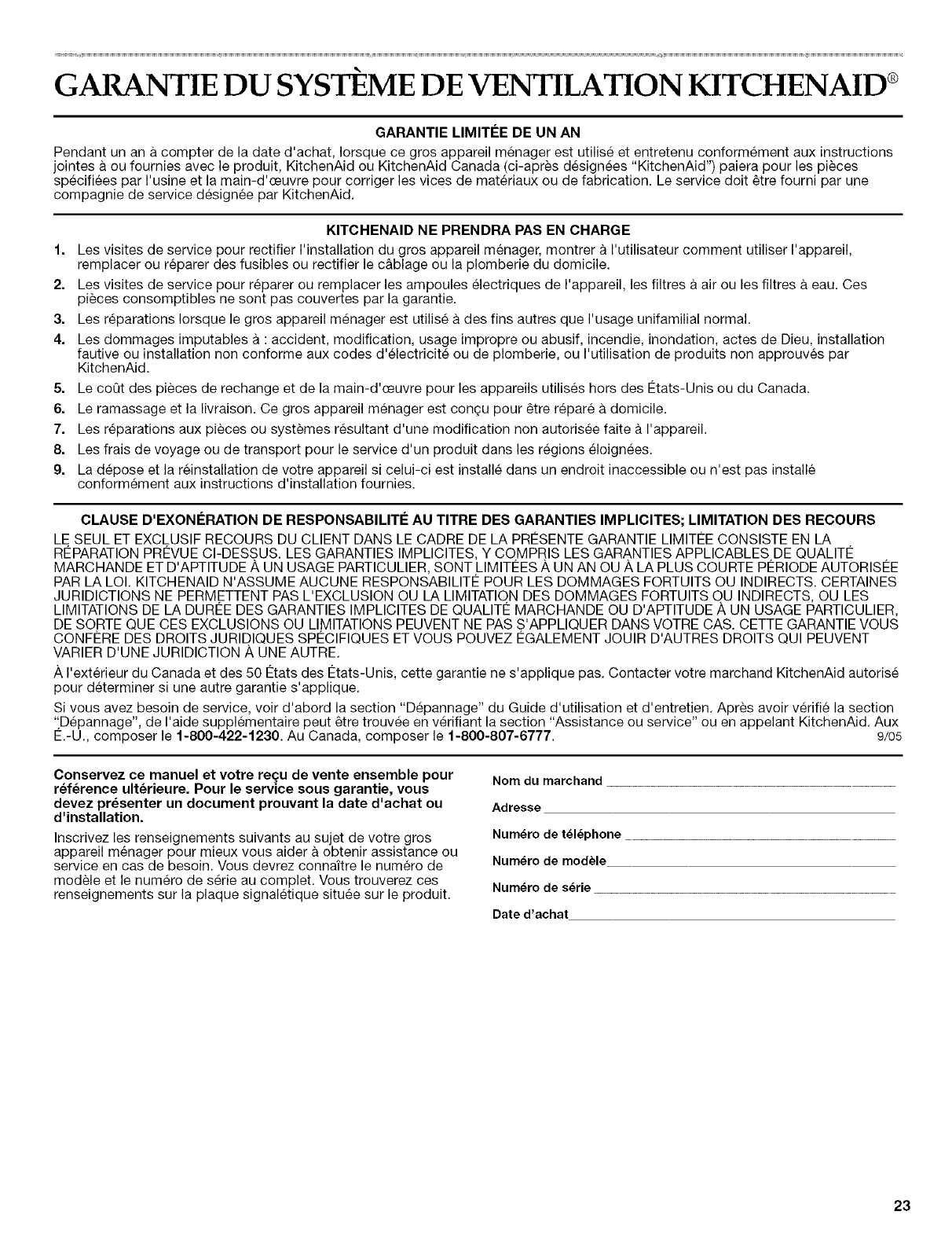 GARANTIE DU SYSTEME DE VENTILATION KITCHENAID ®