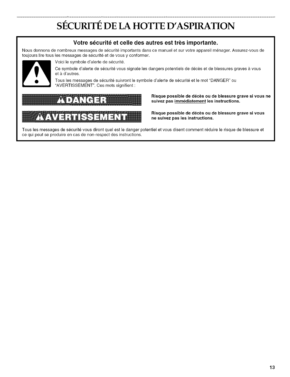 SECURITI :!:DE LA HOTTE D'ASPIRATION ................................ 13