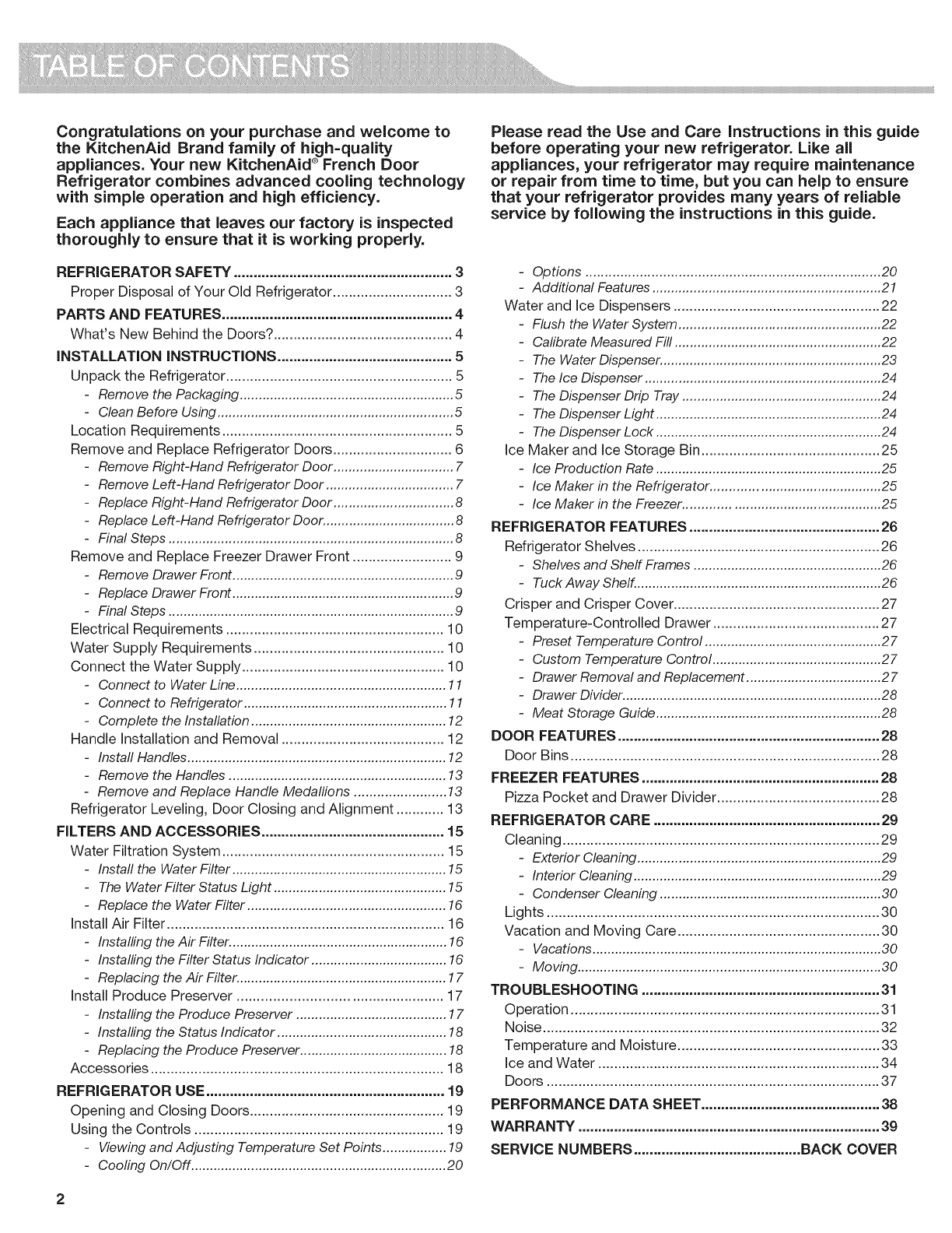 User Manual: Kitchenaid KRFF507EBL00 KRFF507EBL00 KITCHENAID REFRIGERATOR - Manuals and Guides View the owners manual for your KITCHENAID REFRIGERATOR #KRFF507EBL00. Home:Kitchen Appliance Parts:Kitchenaid Parts:Kitchenaid REFRIGERATOR Manual