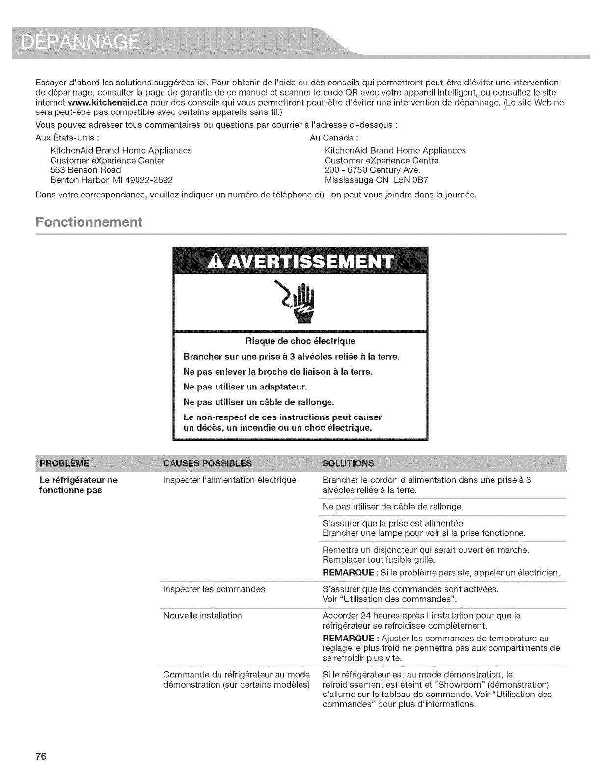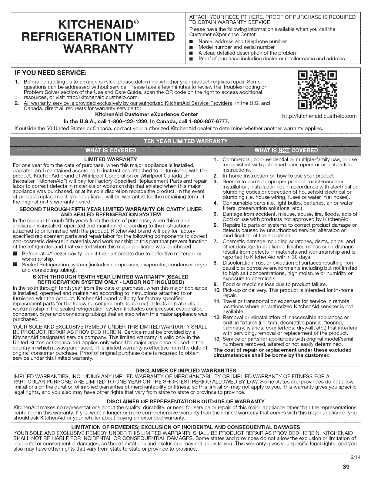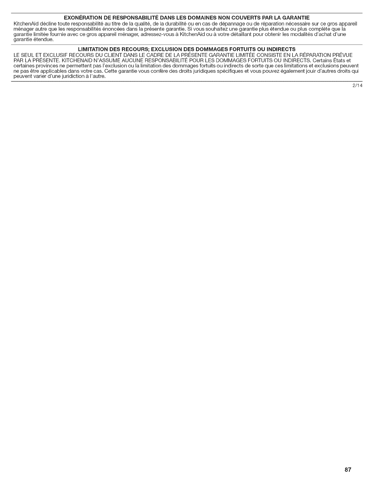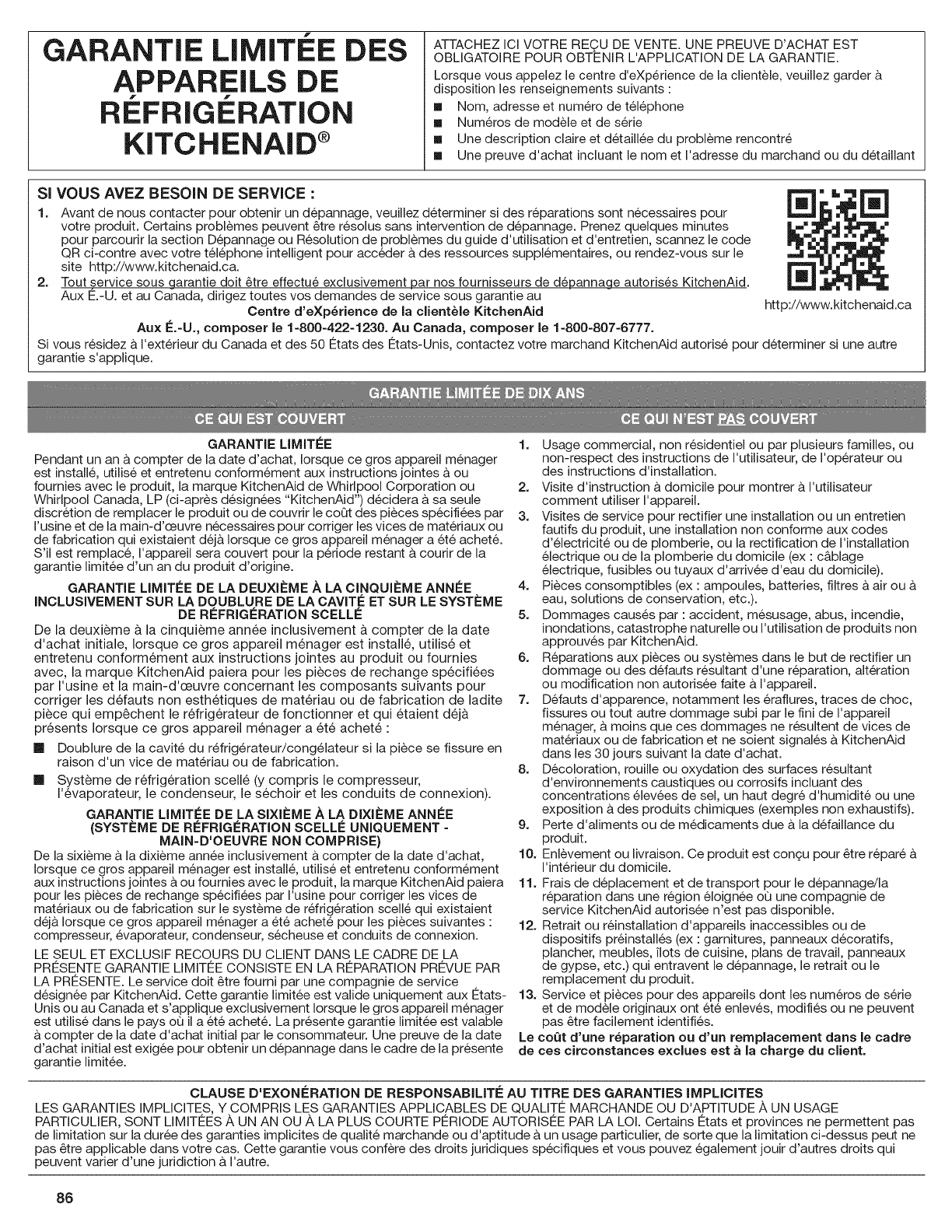 KitchenAid decline toute responsabilite au titre de la qualite, de la durabilite ou en cas de depannage ou de reparation necessaire sur ce gros appareil