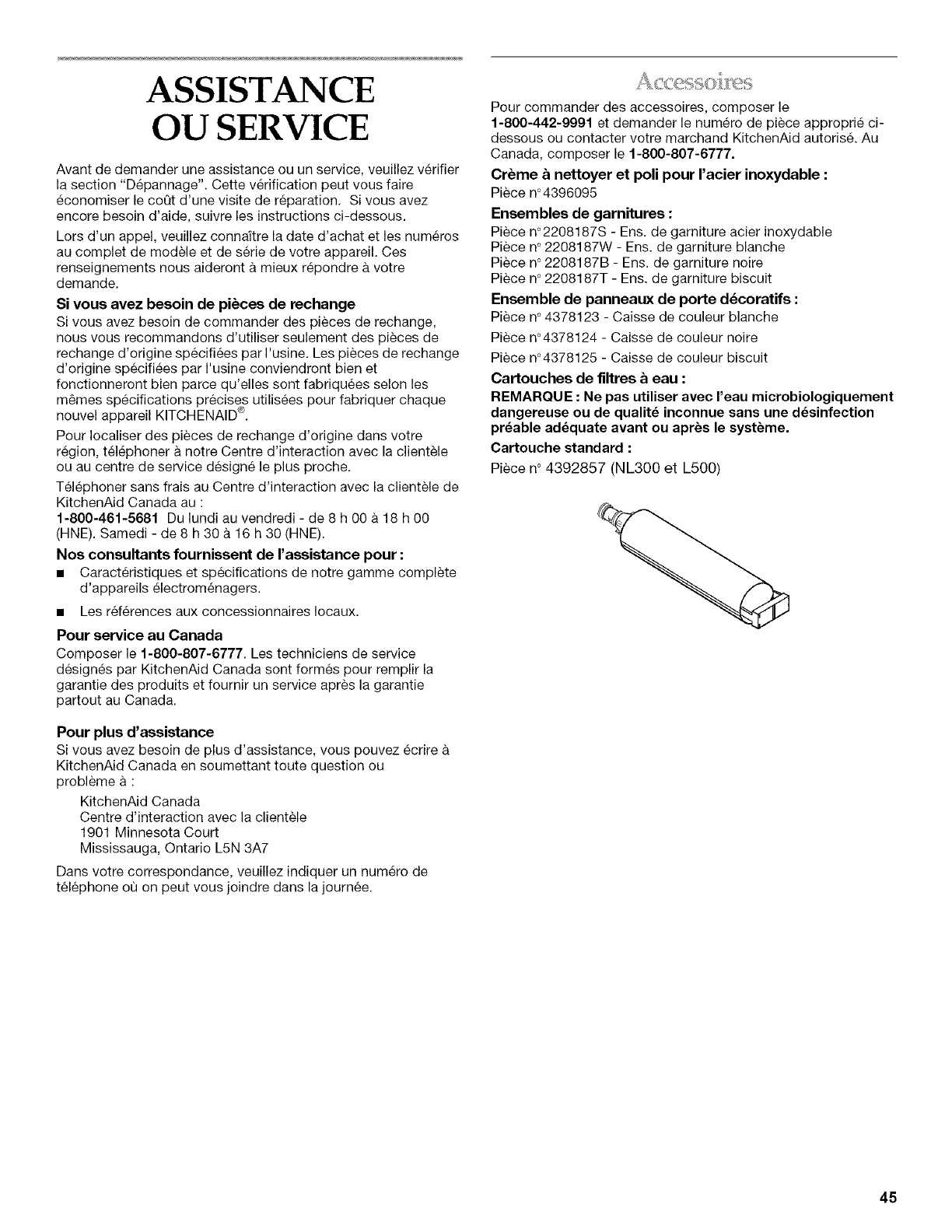 clientele KitchenAid au 1-800-422-1230 (sans frais), de n'importe ou aux €:.-U. Au Canada, contacter votre compagnie de service