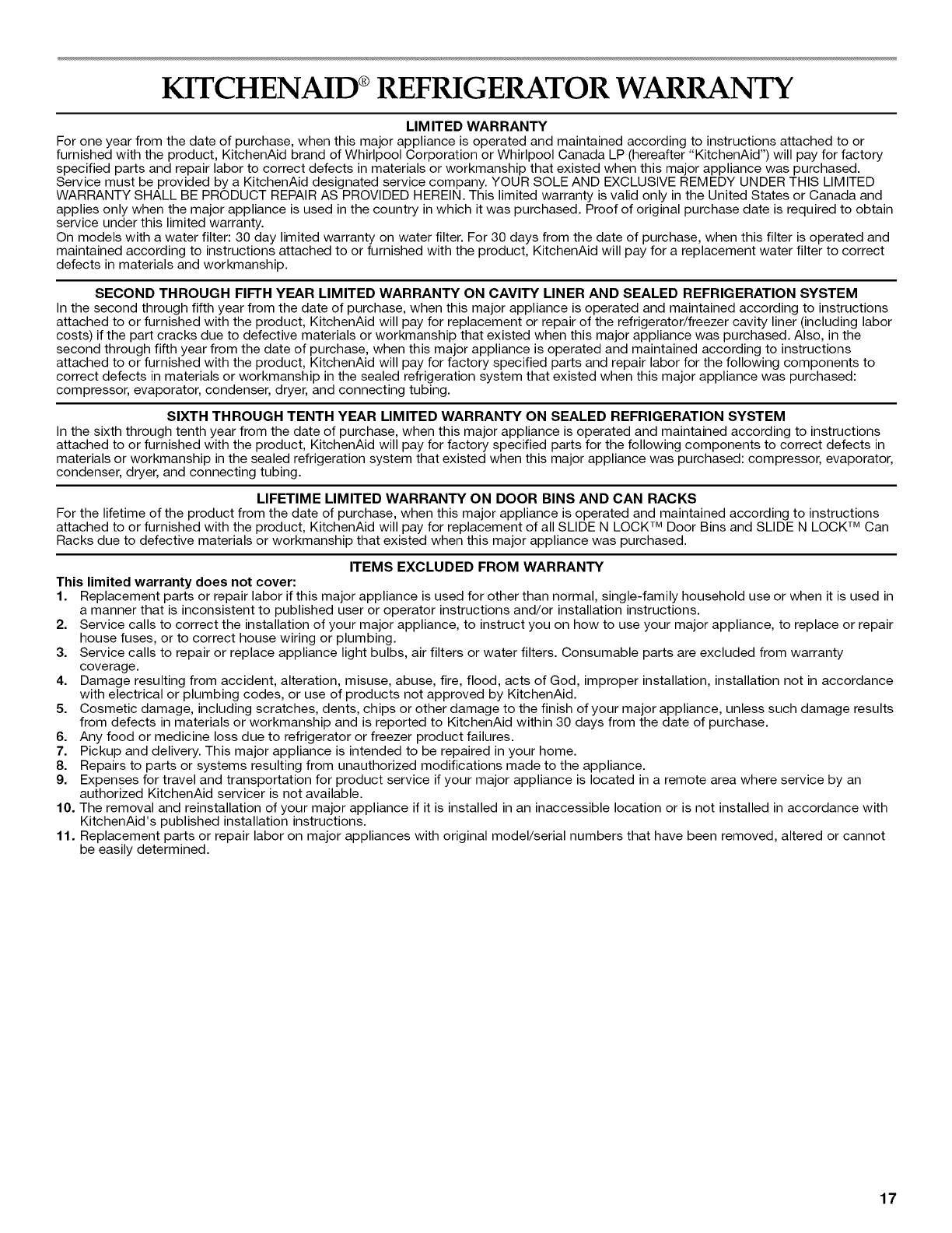 aux instructions jointes & ou fournies avec le produit, KitchenAid paiera pour les pieces spacifiaes par I'usine pour corriger les vices de matariaux ou