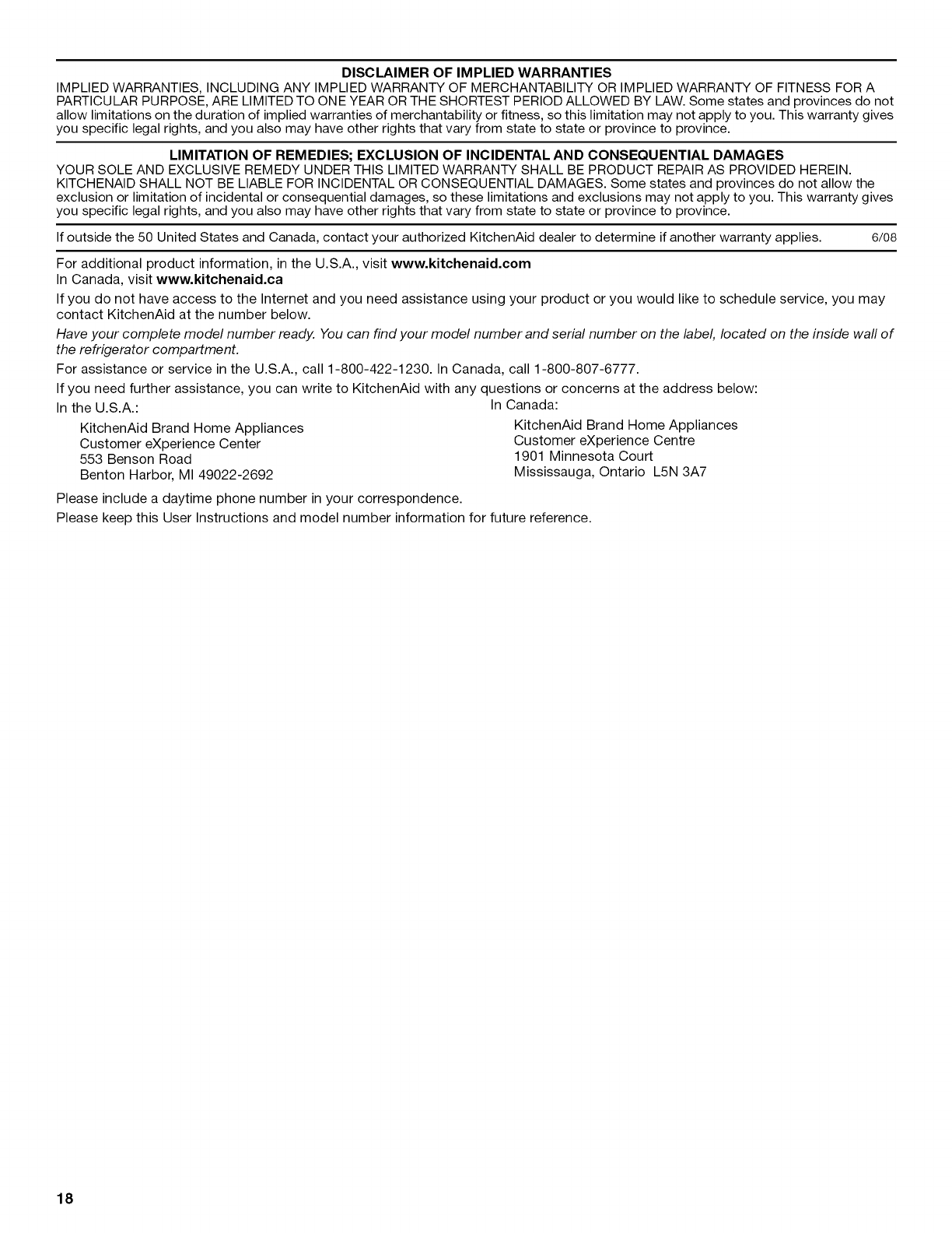 In Canada, visit our website at www.kitchenaid.ca or call us at 1-800-807-6777.