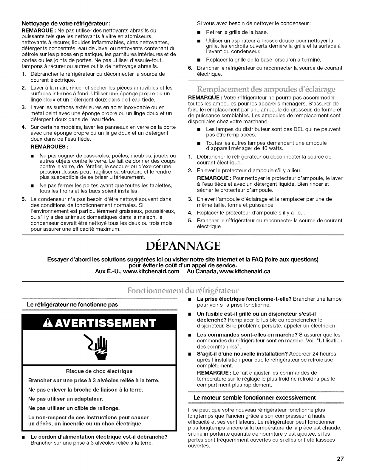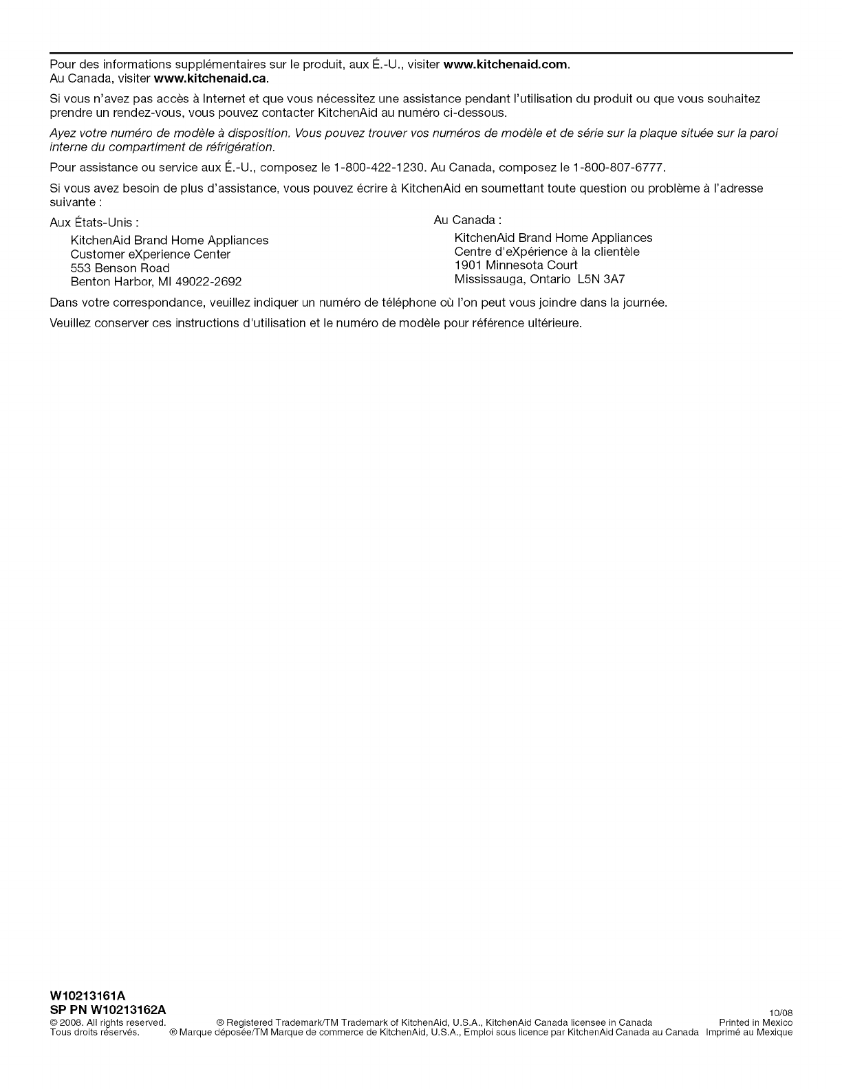 ® Marque deposee/TM Marque de commerce de KitchenAid, U.S.A., Emploi sous licence par KitchenAid Canada au Canada Imprime au Mexique