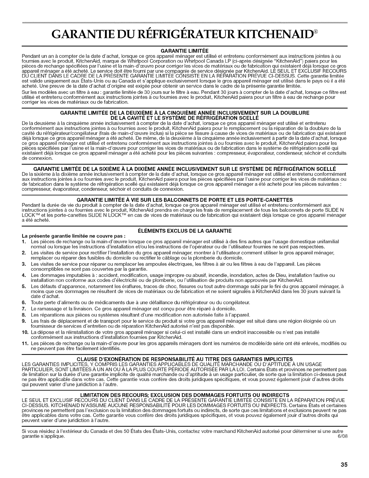 instructions jointes & ou fournies avec le produit, KitchenAid prendra en charge les frais de remplacement de tousles balconnets de porte SLIDE N