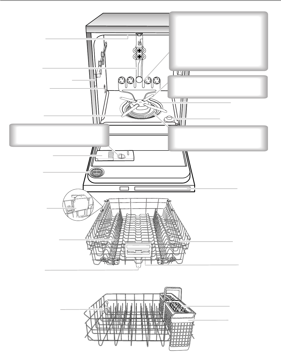 ménager : paniers à vaisselle en nylon et commandes électroniques.