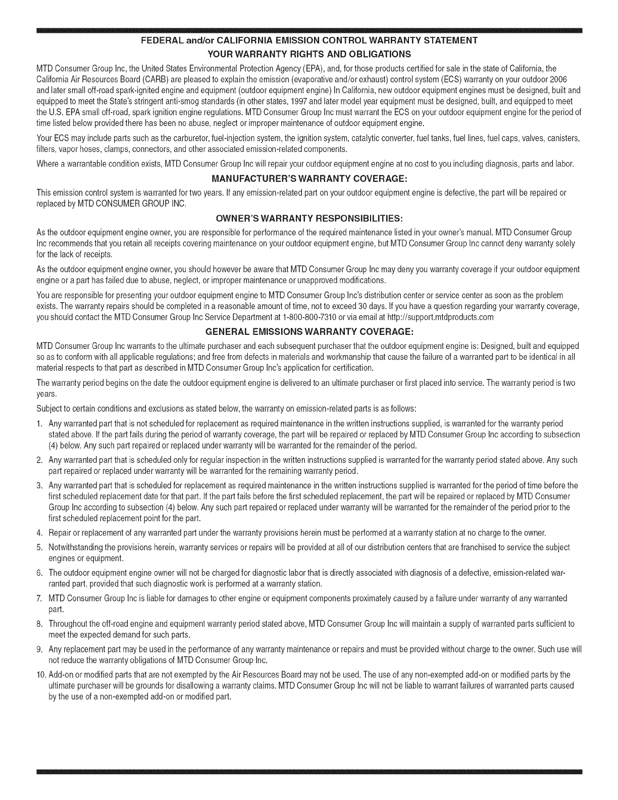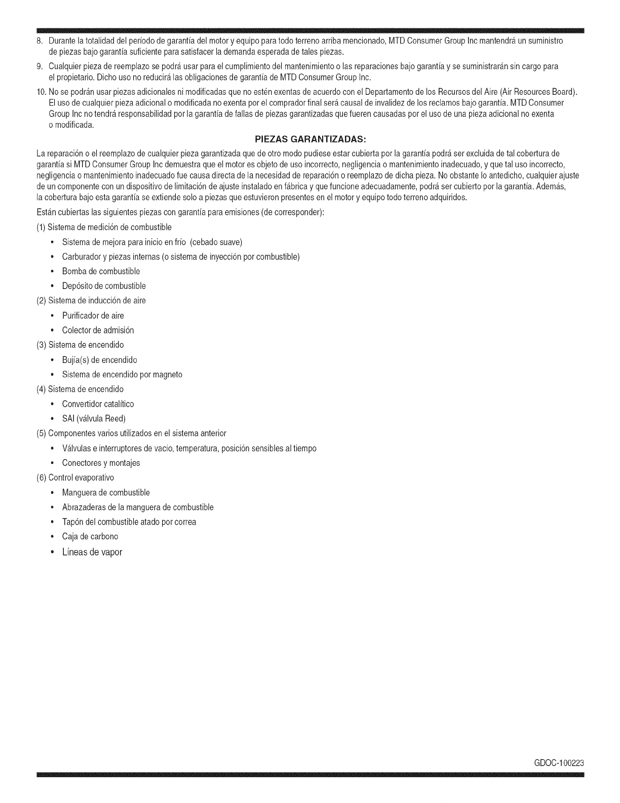 8. Durantelatotalidaddelperiododegarantiadelmotoryequipoparatodoterrenoarribamencionado,MTDConsumerGroupIncmantendr_unsuministro