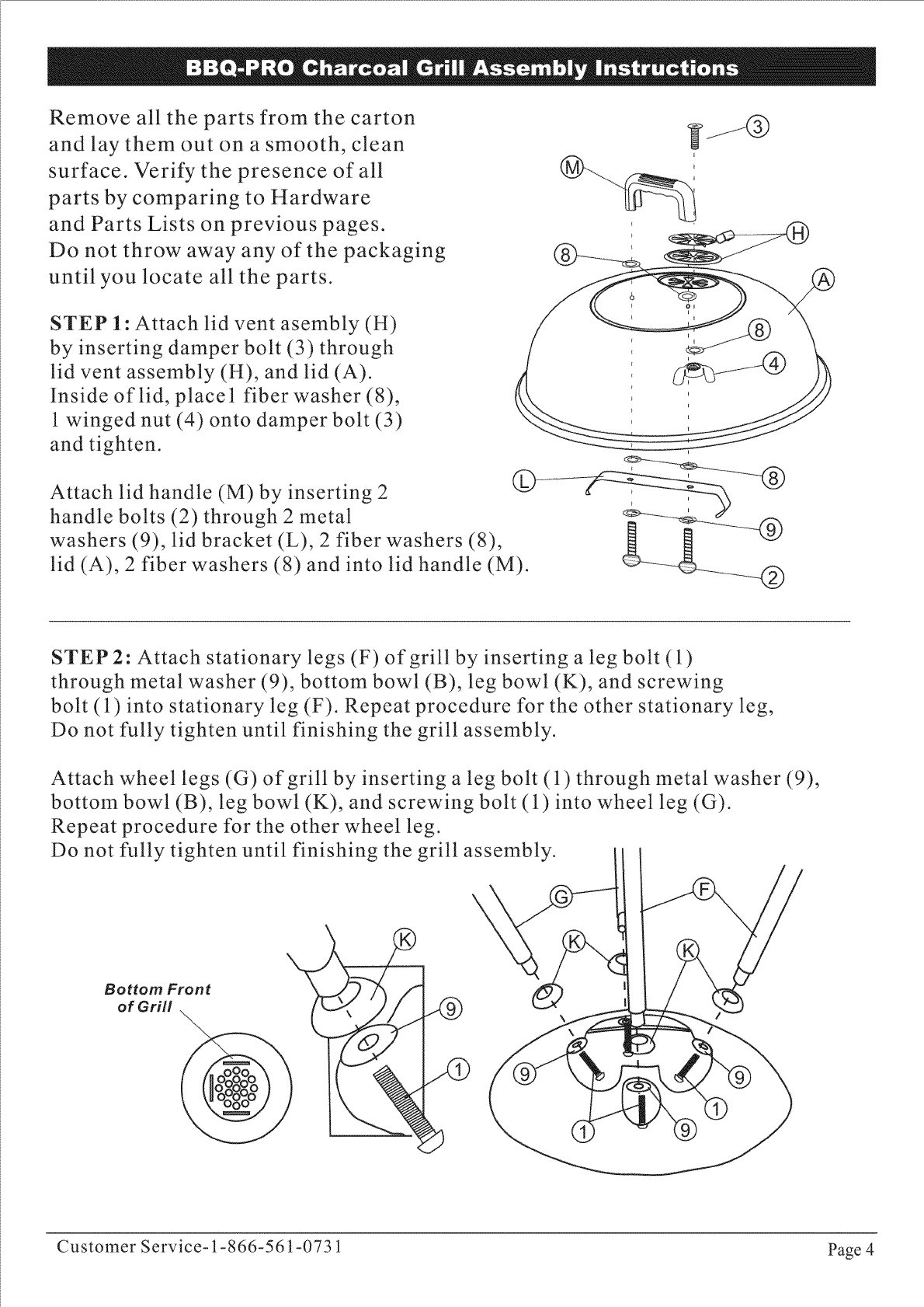 STEP 2: Attach stationary legs (F) of grill by inserting a leg bolt (1)