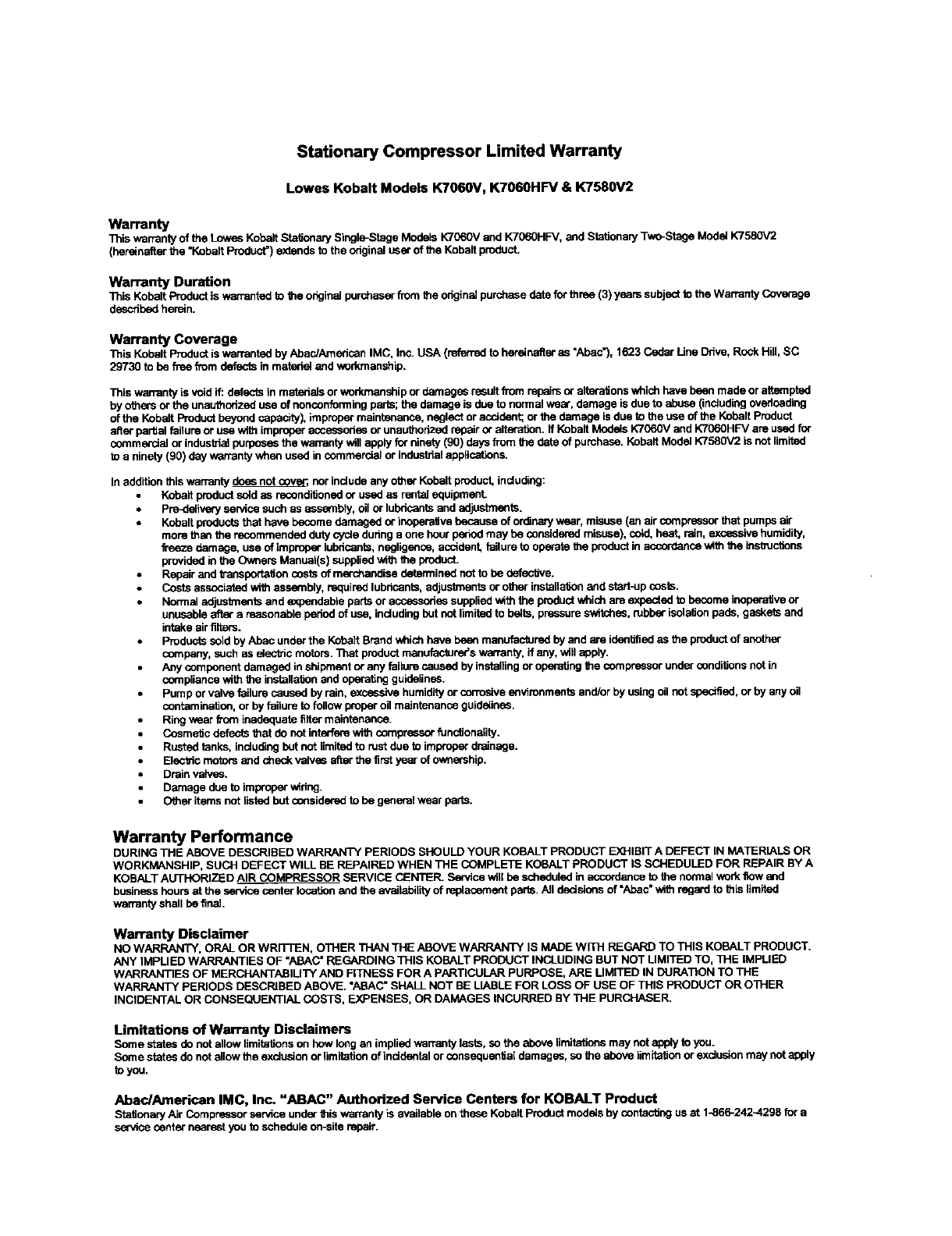 Abac/American IMC, Inc, "ABAC" Authorized Service Centers for KOBALT Product