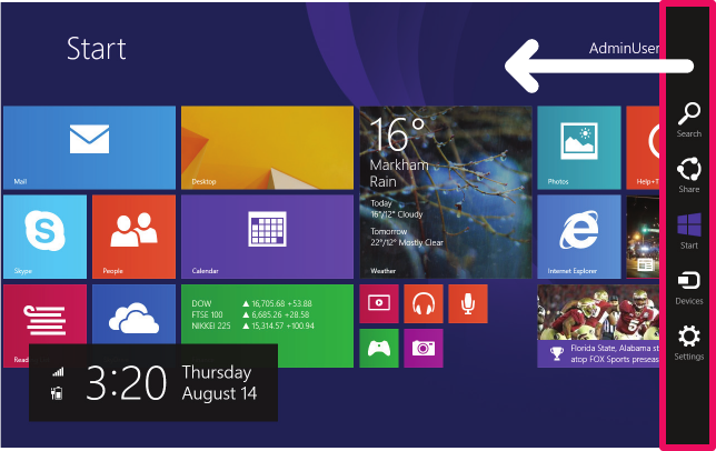 and so on. You can open the Charms Bar by swiping Left from the