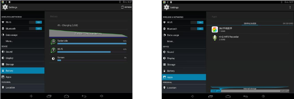 Check battery usage status. Manage downloaded or running applications.