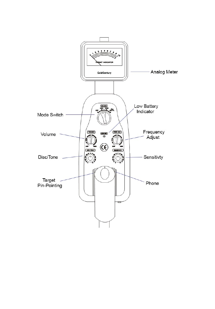 at the top of the handle. Sweep the search coil over the sound area and release